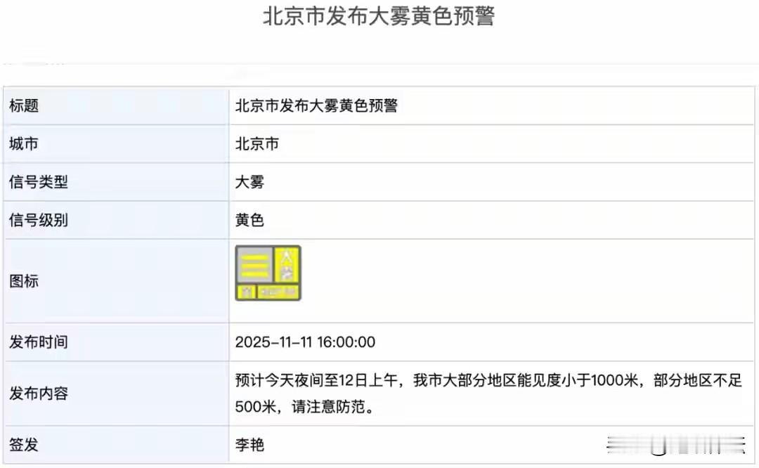 北京市发布大雾黄色预警,请注意防范