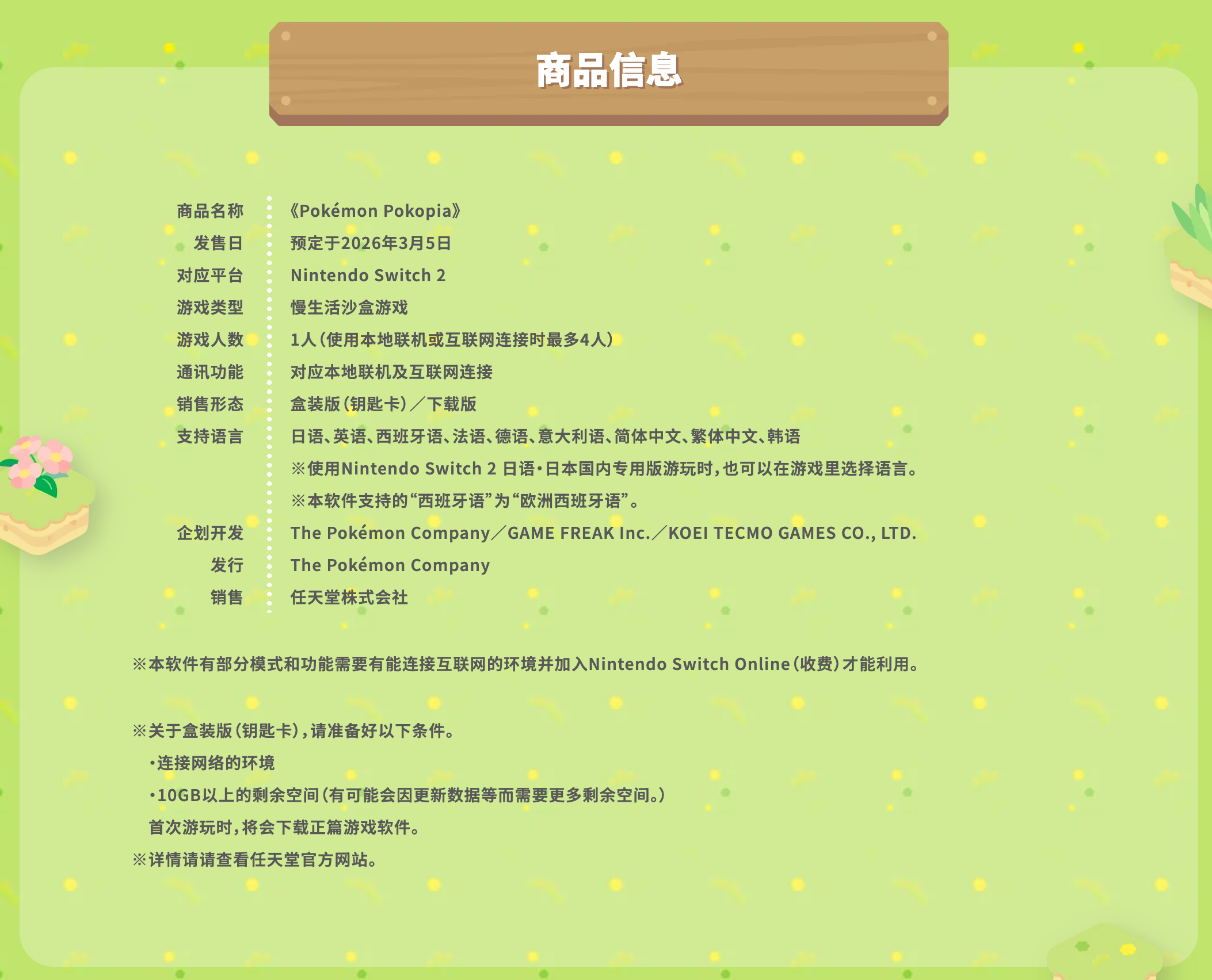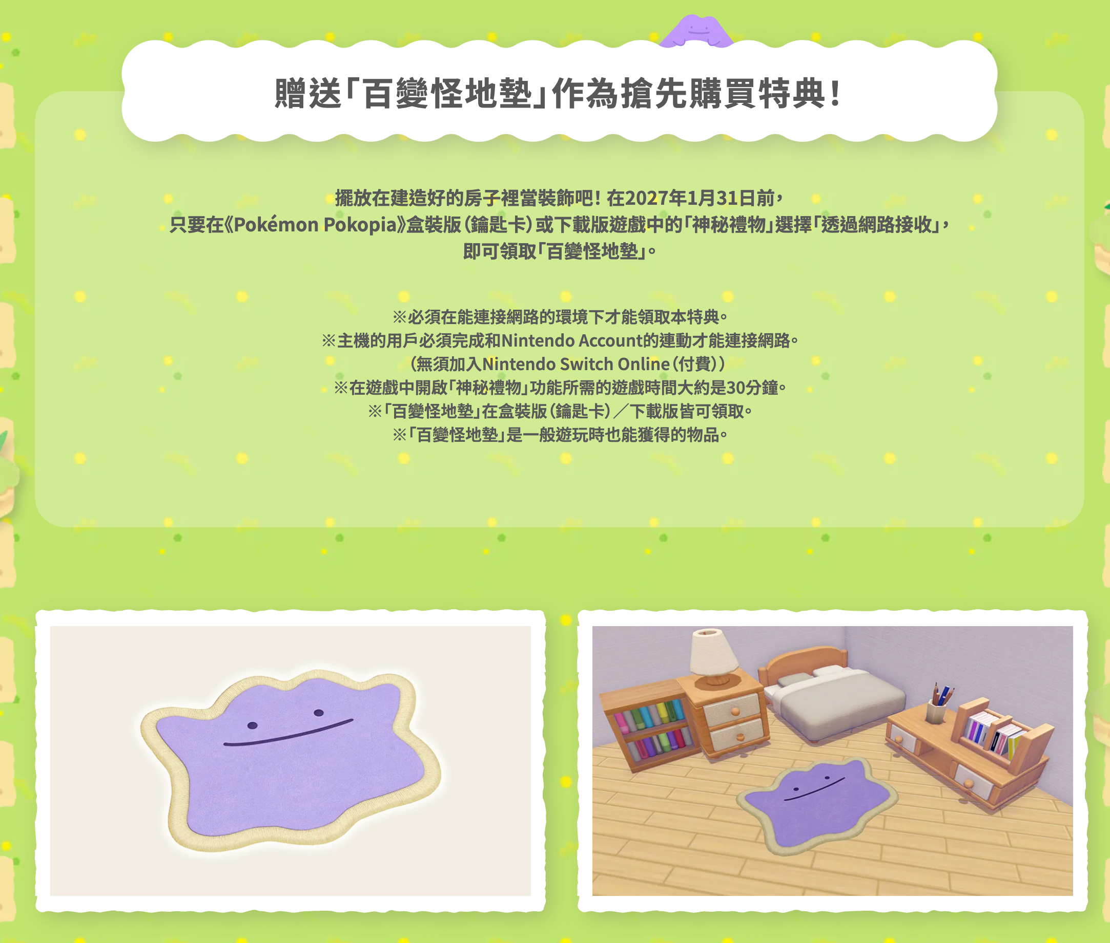 【《宝可梦 Pokopia》预售特典公开】《宝可梦 Pokopia》抢先购买特典公开:在2027年1月31日之前,在《宝可梦 Pokopia》盒装版(钥匙卡)或下载版游戏中的“神秘礼物”,选择“通过互联网接收”即可领取“百变怪地垫”。《宝可梦 Pokopia》数字版将于11月12日起陆续开启预购,港服eShop的售价为449港币。游戏需要10GB以上的可用空间,另外在游玩日语版Switch 2时,可以通过游戏内设置来选择中文。《宝可梦 Pokopia》计划于2026年3月5日发售。