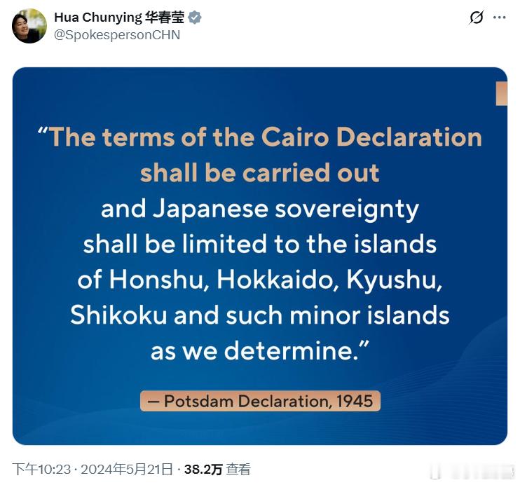 在2024年5月21日,华姐发了一张图。“《开罗宣言》的条款将得到执行,日本的主权将仅限于本州、北海道、九州、四国和我们确定的其他小岛。”——1945年的《波茨坦公告》。