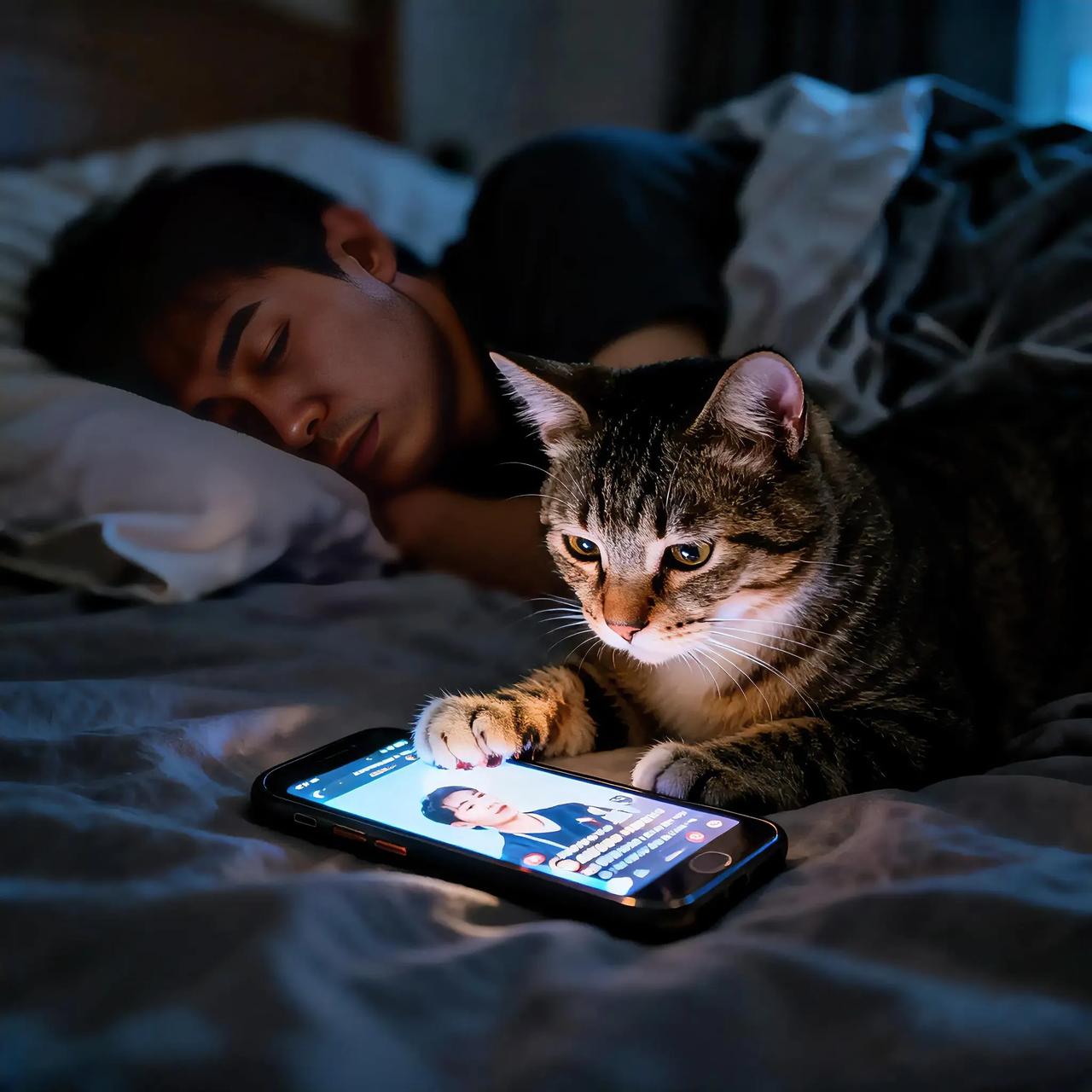 猫咪深夜刷手机?这波操作笑不活了! 铲屎官睡着后,猫咪踩中手机刷了一整晚短视