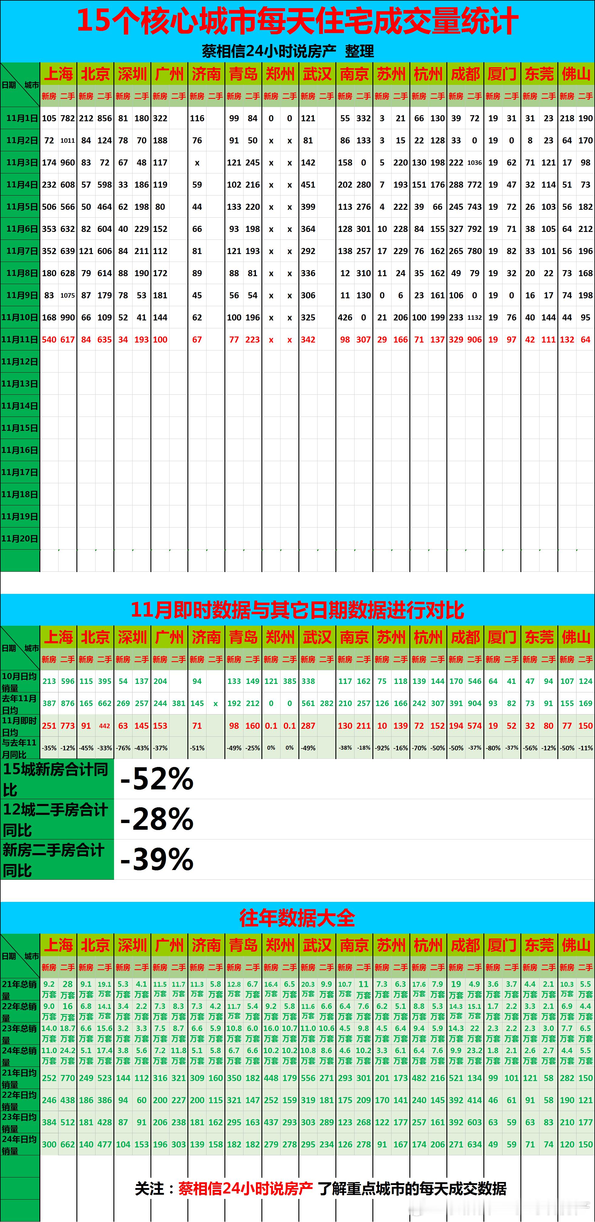 11月10日,重点城市住宅销量数据【广告→→→】博主创作不易,几年来,一直在用爱发电,求哥哥姐姐,弟弟妹妹们买点东西吧。质量都非常好,价格也很实惠。都是日常需要的消耗品,所以买了也不算是白花冤枉钱 ,而且还暖心的支持了博主的创作,万分感谢【点击链接去淘宝购买垃圾袋→】今日点评:11月新房同比下降52%,二手房同比下降28%。上海新房日均销量207套,同比下降42%,已经低于2022年大管控年的数据了。
