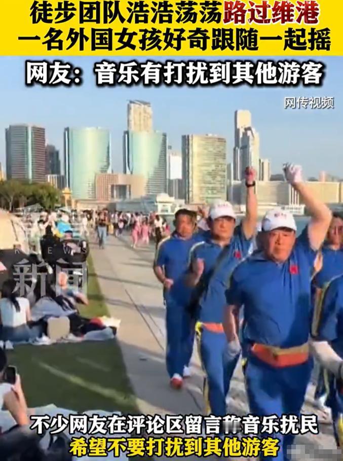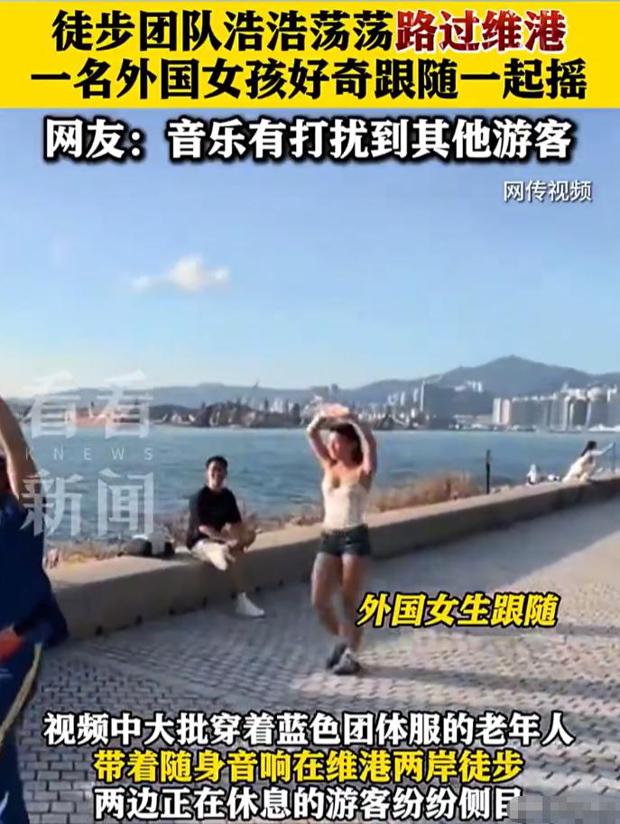 这合适吗?香港,一群老年暴走团现身在维多利亚港,一边公放着音乐,一边徒步,而根据领队介绍来看,他们一行人是从深圳出发,乘坐旅游大巴来到香港的,他们倒是相当自豪,但不少网友看到后却跟着红了脸 近日,一批来自内地的老年徒步团体走进香港的多个热门景点,原本旨在健身的徒步活动,却因特殊的表现形式引发了广泛讨论。 这群身着统一蓝色服装的老人,在组织者的带领下,从深圳乘坐旅游大巴专程赴港,将徒步路线选在了维多利亚港、西九文化区、麦理浩径等香港本地人与游客高度集中的公共区域。 行进过程中,老人们列队前行,不少人随身携带小型音响,播放着节奏鲜明的音乐,同时伴随着整齐的步伐与夸张的甩手、踢腿动作。 团队的带队者一边拍摄记录,一边高声告知镜头前的观众所处的位置,语气中透着明显的自豪。 这样的场景打破了景点原有的宁静,原本前来感受海风与城市风光的游客,要么被迫绕道避开行进的队伍,要么只能在喧闹声中勉强游览,轻松的氛围被尴尬取代。 在现场,不同游客呈现出截然不同的反应。 有外国游客被队伍的热情所吸引,一时兴起跟在后面模仿动作,场面显得有些滑稽; 但更多旁观者则皱起眉头,选择远远避开,不愿被高分贝的音乐和整齐的口号打扰。 随着相关视频在网络上传播,各类声音纷纷涌现,有网友直言这样的行为让人不适,也有情绪更为激烈的建议,希望香港方面能采取措施加以约束。 其实这类徒步团体的类似行为,在大陆早已不是新鲜事。 他们大多由专人组织,成员以退休老人为主,这些老人时间充裕、精力旺盛,经济上也较为宽裕,使得他们有条件跨区域开展活动。 此前,该类团体就曾因在大陆城市占道行走、高声扰民等问题多次受到网友批评,部分城市还专门针对占道行为下发过整治通告,媒体和网友也反复呼吁文明健身,但由于群体的特殊特质,相关行为始终未能得到有效收敛。 与大陆的治理困境不同,香港对公共空间的秩序管理一向严格。 在香港的公共场合,抽烟、随地吃东西等行为都可能面临罚款,对于这类占据人行道、高声扰民的团体活动,一旦被认定为阻碍通行或影响他人,同样大概率会受到处罚。 这与该徒步团体在公共空间中“自我尽兴即可”的行为逻辑,形成了鲜明的碰撞。 这群老人或许并未意识到,公共空间的使用权属于每一位使用者,没有任何群体有资格独占其节奏与氛围。 徒步健身本身是值得肯定的健康选择,但健身的权利不应建立在侵犯他人权益的基础上。 如果想要享受集体活动的热闹,完全可以选择空旷的专用场地或远离人群的区域,而非在游客密集的热门景点,用高分贝音乐和队列行进的方式干扰他人。 在网络上的诸多讨论中,不难发现大家的核心诉求并非反对老年群体健身,也不是排斥内地游客,而是对“无视他人感受”的行为表示不满。 当有闲有钱的群体跨区域出行时,自我约束往往比制度管控更为重要。 香港的公共空间规则,本质上是为了保障每一位使用者的合法权益,无论是本地居民还是外地游客,都应当遵守当地的公共秩序。 这场争议的核心,说到底是公共文明边界的问题。 健身无需受限,但必须以不影响他人为前提;集体活动可以热闹,但不能逾越公共空间的规则底线。 希望这类徒步团体能正视各方反馈,在享受健身乐趣的同时,多一份对他人的体谅,让公共空间真正成为所有人都能安心使用的共享资源。 今天的分享到这里就结束了,大家对此事有何看法,欢迎在评论区留言和讨论,感兴趣的可以点击头像加关注,我将每日更新优质内容,我们下期见。