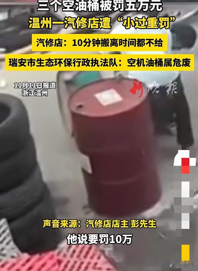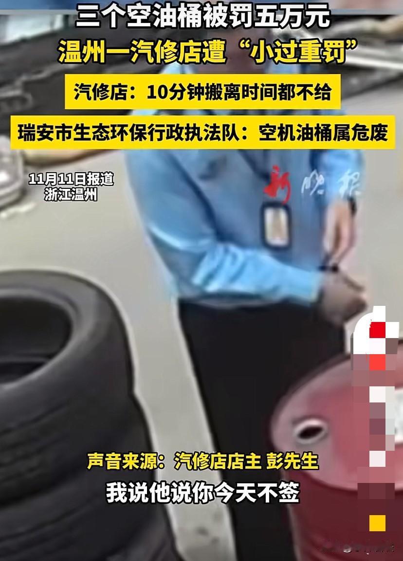 “冤不冤?”浙江温州,一汽修店老板院内放了三个空油桶,不料,瑞安市环保执法队来检查,称空机油桶属于危废,签字就罚你5万,不签字数罪并罚,罚款10万。汽修厂老板:“里面没有油,10分钟搬离时间都不给吗?” 据悉,彭先生像往常一样在汽修店里忙碌着。因为厂房装修,他临时把三个空机油桶放在了院内。 这些油桶之前是装机油的,现在里面基本没油了,就是底部还有那么一点点残渣,而且桶都是密封得好好的,一般工具根本打不开。 彭先生想着,等装修弄好了,再把这些桶放回店里的危废房去。 可谁能想到,瑞安市环保执法队突然来检查了。执法人员一眼就看到了那三个空油桶,当场就认定这是“擅自露天堆放危险废物”。 彭先生赶紧解释,说这只是临时放一下,马上就会搬走,里面也没多少油了,能不能给10分钟时间搬离。 但执法人员根本不买账,直接拿出了处罚通知,说签字就罚5万,不签字就数罪并罚,罚款10万。 彭先生当时就懵了。他觉得自己太冤了,这空油桶又不是什么大危险,而且自己也不是故意要露天堆放的,只是临时情况。 再说了,就算要处罚,也得给个整改的机会吧,怎么就直接开罚单了呢? 那么,从法律的角度看彭先生到底冤不冤呢? 根据《中华人民共和国固体废物污染环境防治法》相关规定,对于擅自倾倒、堆放危险废物等违法行为,处以十万元以上一百万元以下的罚款。 彭先生只是临时将三个空机油桶露天放置在院内,油桶密封良好,内部残油极少,且是因厂房装修这一临时情况导致,并非恶意长期违规堆放危险废物,违法情节相对较轻。 个人认为行政处罚的目的不仅是惩罚违法行为,更重要的是纠正违法行为、教育公民自觉遵守法律。 对于像彭先生这样的小微企业主,执法部门可以先进行提醒和教育,责令其在一定期限内整改。 如果彭先生拒不整改或者整改不到位,再依法进行处罚,这样既体现了法律的严肃性,又体现了执法的人性化。 对此,大家觉得呢?