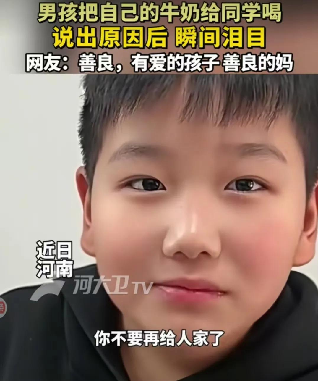 河南男孩天天送牛奶给同学,妈妈追问后哭成泪人!真相太好哭 河南一位妈妈最近愁坏了——给长个子的儿子买的牛奶,他一口不喝全送同学,这操作谁看了不纳闷? 妈妈本来寻思,这牛奶是儿子平时爱喝的款,咋到学校就大方送人了?难道是被欺负了?追问之下,儿子一句话让她心揪了:“他没有妈妈。”妈妈瞬间破防,立马说:“那明天带两瓶,你俩一人一瓶!” 没想到儿子又补了句:“能带三盒不?”原来同学还有个小妹,每次都把牛奶省下来带回家,这双向的暖心操作直接让妈妈哭成泪人,当场拍板:“管够!” 这男孩的善良跟小太阳似的,照得人心里暖洋洋;妈妈更是明白人,没浇灭孩子的善意反而添柴。现在不少家长总教孩子“别吃亏”,但这娃用行动告诉我们:最好的教养,是见人难时伸把手。 教育哪用天天唠叨?把孩子教得心里有光,比啥都强!你家娃做过啥暖心小事?来唠唠~