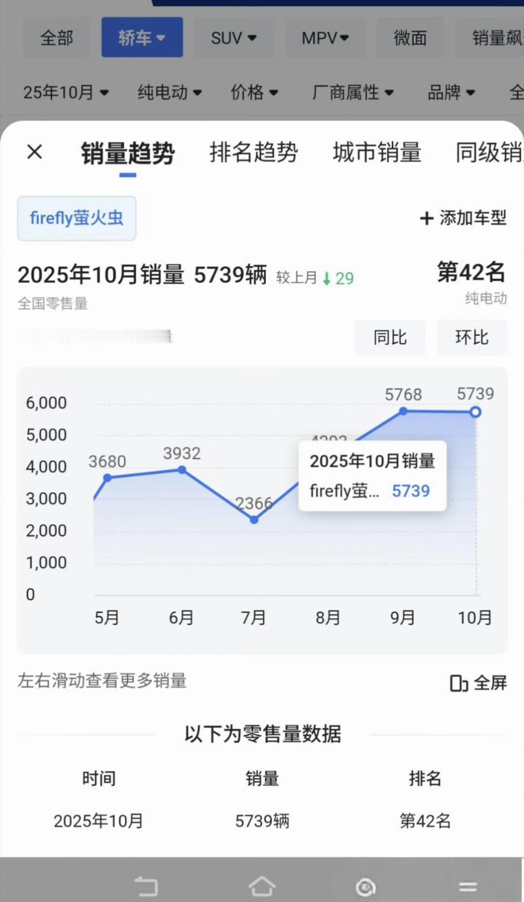 今年对蔚来出现误判的一件事就是: 萤火虫。 当时出来的时候,觉得他丑萌丑萌的,肯定凉了。 但是没想到家里他最小,反而他最争气。吭哧吭哧一个月爬上5700+辆了,比同级别纯电小车卖的好多了。 可能是有格调的年轻人,喜欢一个有个性,有设计感的小车,萤火虫刚好对胃口。 ​​​【来自懂车帝车友圈】