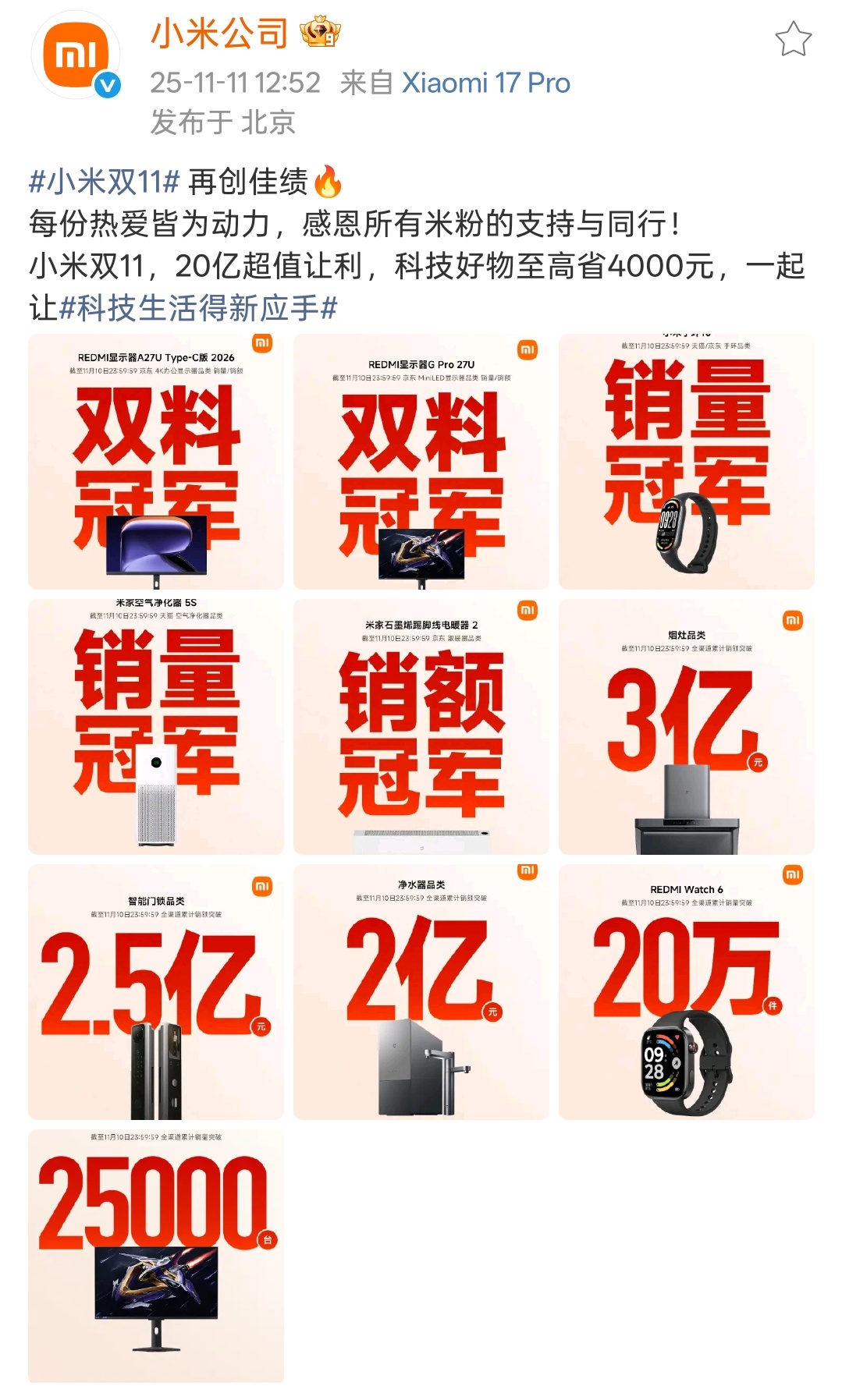 小米双11今年不少品类仍旧是销量冠军,卖得很好,深受用户喜欢。手机方面小米17系列和REDMI K90系列早早发售,首销量已经很高了,整体在这波黄金销售周期内小米销量还是很猛的,雷总也应该很满意。