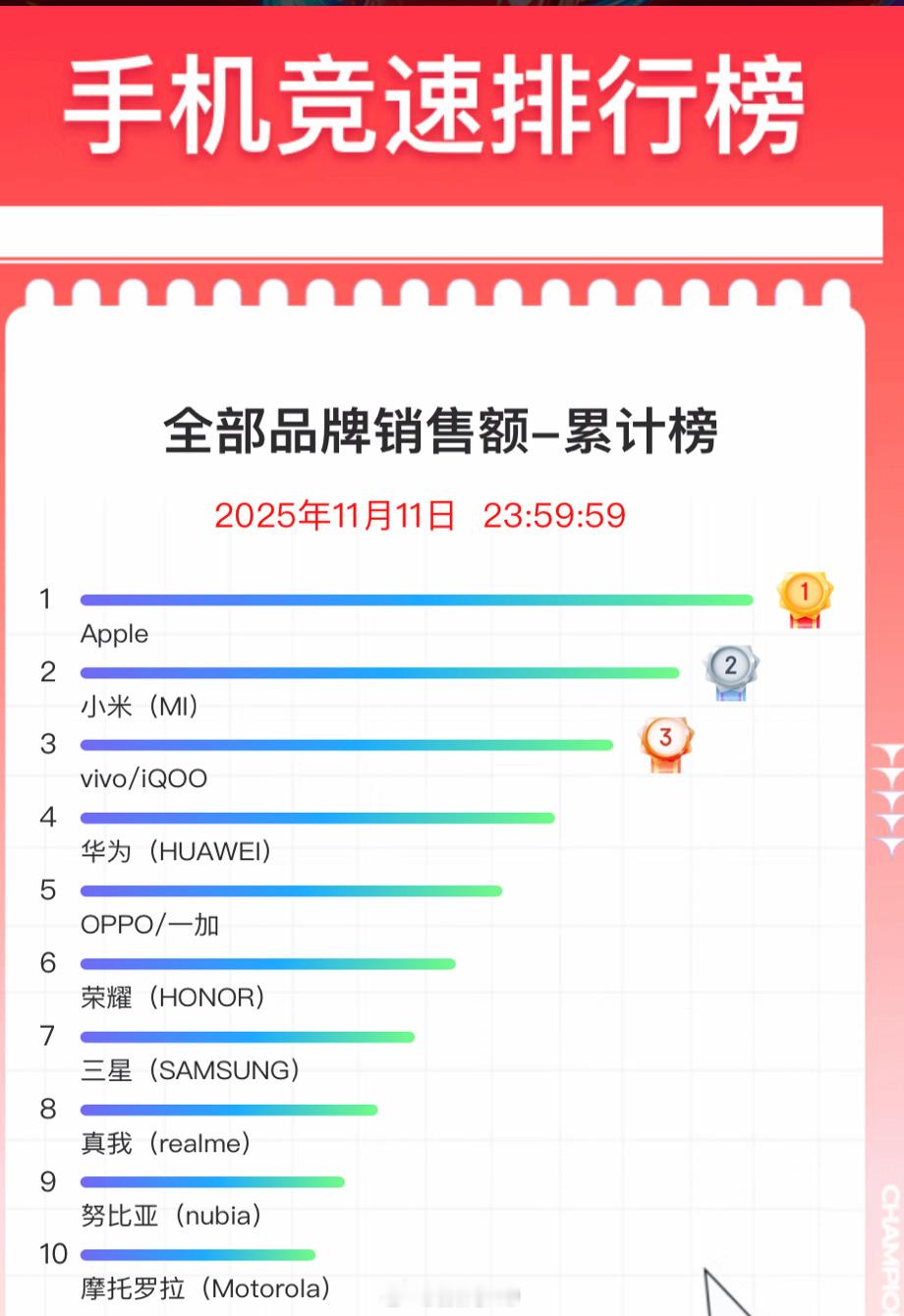 双十一结束了,无论是销量,还是销售额,前三名分别是苹果、小米、vivo。
