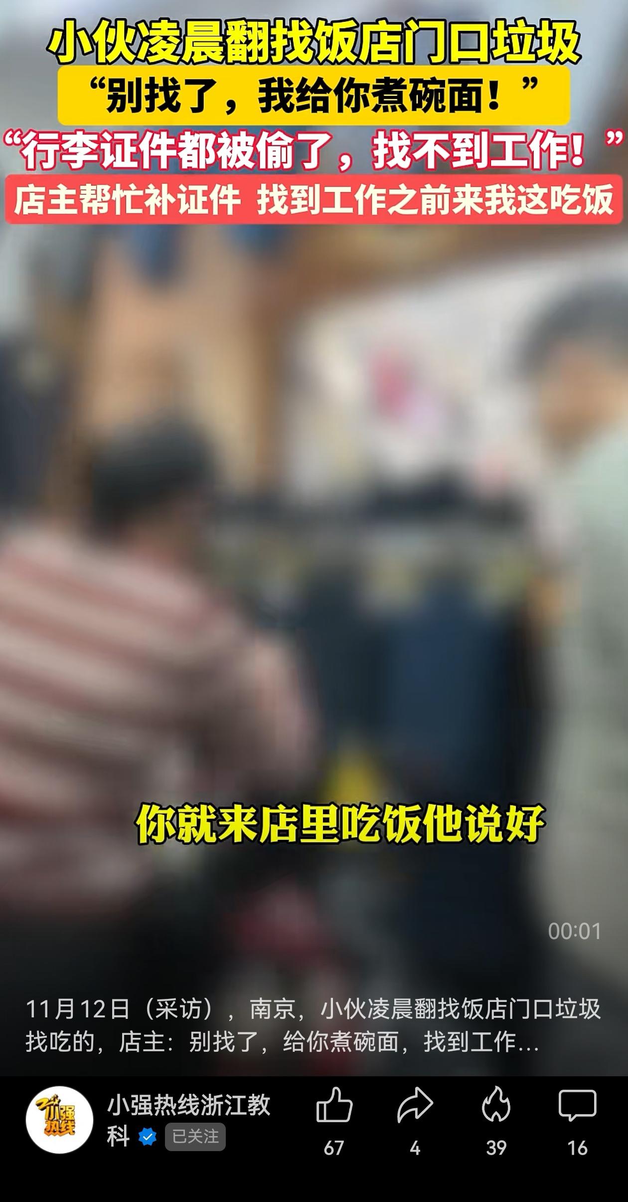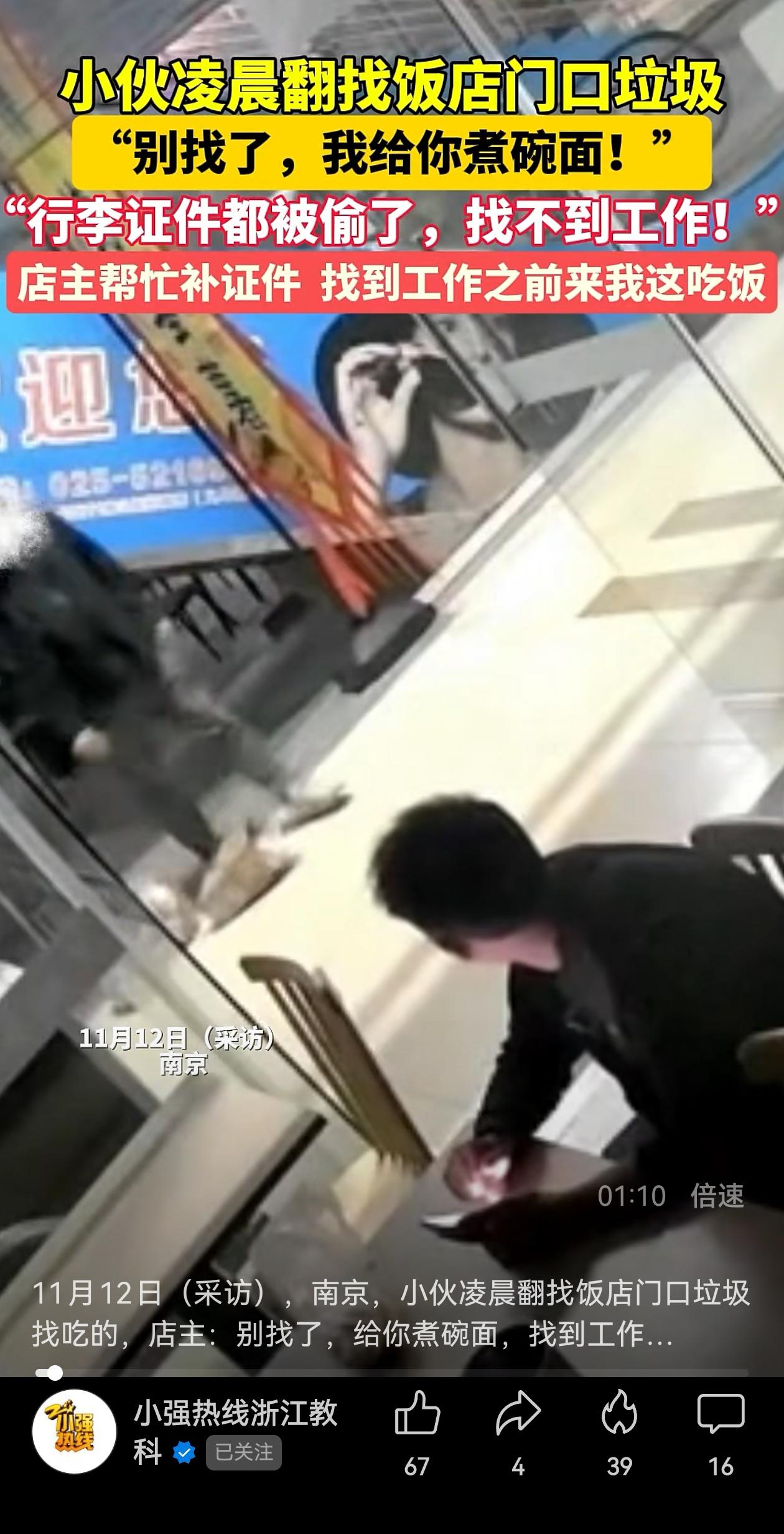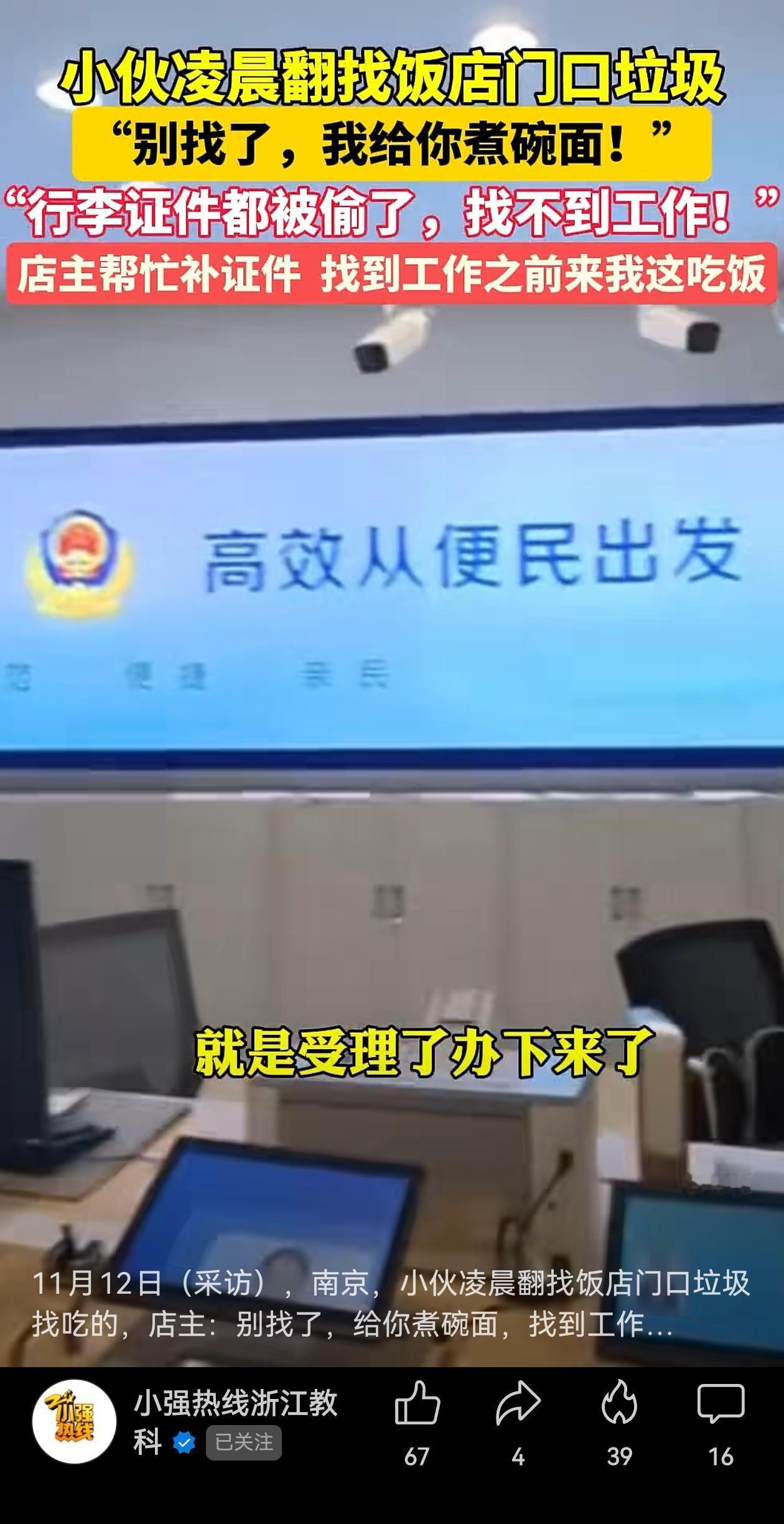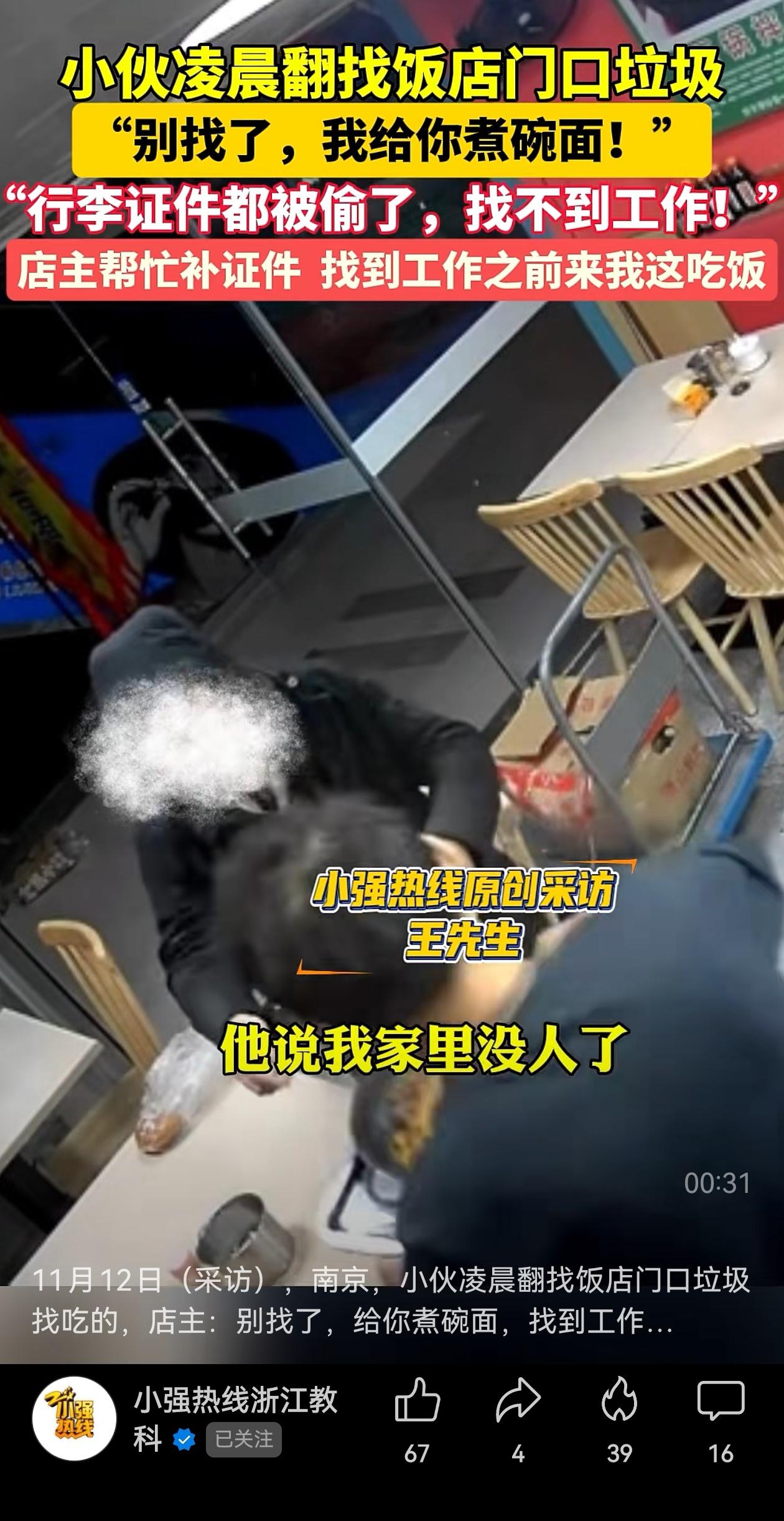 南京的这个饭店老板,仗义!南京,一个流浪的年轻人,夜深人静时到了老板的饭店门外,翻找垃圾找吃的,被老板看见,询问后知道年轻人因为生意失败,投奔朋友行李被偷,手机、身份证啥都没有了。 老板顺手拿起桌上的面包,递给年轻人,感觉一个面包应该不够,又主动为年轻人煮了碗面。 能做到这些已经算很善良了,可这位店主,更周全,因为询问年轻人怎么不找家人时,年轻人回答“家里没人了”。 一句“家里没有了”,彻底把老板的心扎痛了。 眼前这小伙是真真正正的“孤身一人”,天大地大,连个能打电话求助的人都没有。 年轻小伙连办理身份证的20块钱都拿不出来,第二天,老板带着年轻人到派出所办理身份证;理发;买厚衣服…… 年轻小伙说,自己有了身份证就可以挣钱了,有了钱可以还老板的钱了。 老板最后还给了年轻人一张“长期饭票”:“没有找到工作之前,就来店里吃饭”! 老板说自己也经历过低谷,所以懂得“帮一把不算什么”,自己淋过雨,就特别想给别人撑把伞。 老板的义举,已经远远超出了一时“发善心”的范畴了!不仅给了跌入谷底的人喘口气的机会,还递出了攀爬出低谷的楼梯! 希望这个年轻人在这位南京饭店老板的温暖托举下,走上坦途,越来越好! 信息来源:小强热线浙江教科