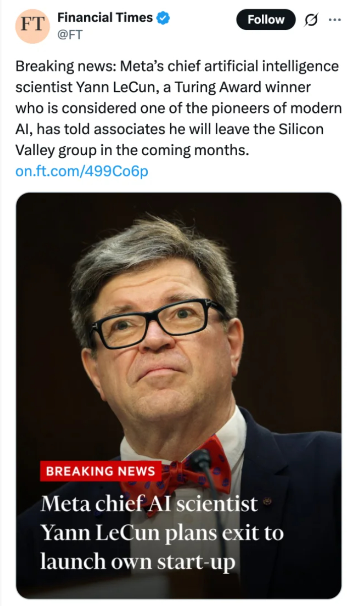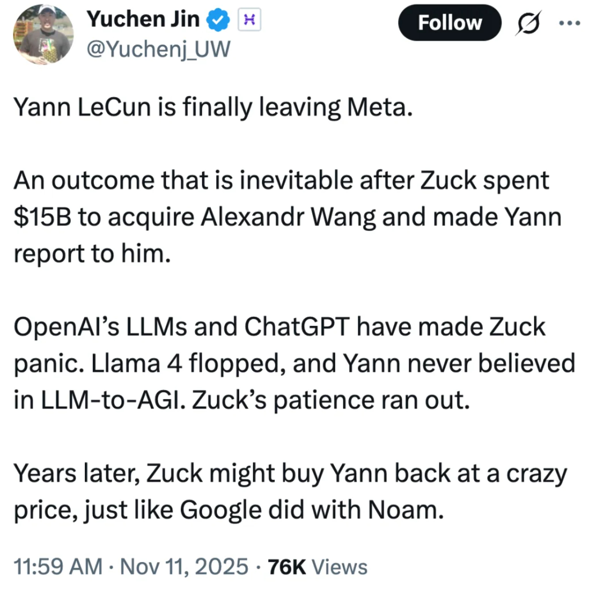 深度学习三巨头之一、图灵奖得主杨立昆,已经从 Meta 离职,准备启动自己的 AI 创业公司。杨立昆在 Meta 十年,是 FAIR(Meta 基础 AI 研究院)的灵魂人物,也是 LLaMA 系列背后的关键力量。但过去一年,Meta 的 AI 战略发生明显转向:1.扎克伯格把资源从基础研究转向 大模型商业化2.AI 组织架构连续调整、600+ 研究人员裁撤3.新的决策线改为偏产品、偏落地,而非长期科研而杨立昆的理念恰好相反:LLM 不是通向 AGI 的唯一道路。他坚持 世界模型与长期基础研究,这与 Meta 当前的ALL IN 商业化路线越来越不兼容。更爆的一点:外媒消息称,当 Meta 为加速产品化收购 Alexandr Wang 后,杨立昆被要求向这位年轻 CEO 汇报。一个坚持科研的科学家,被放到以速度和交付为优先的链条上,走不下去一点不意外。