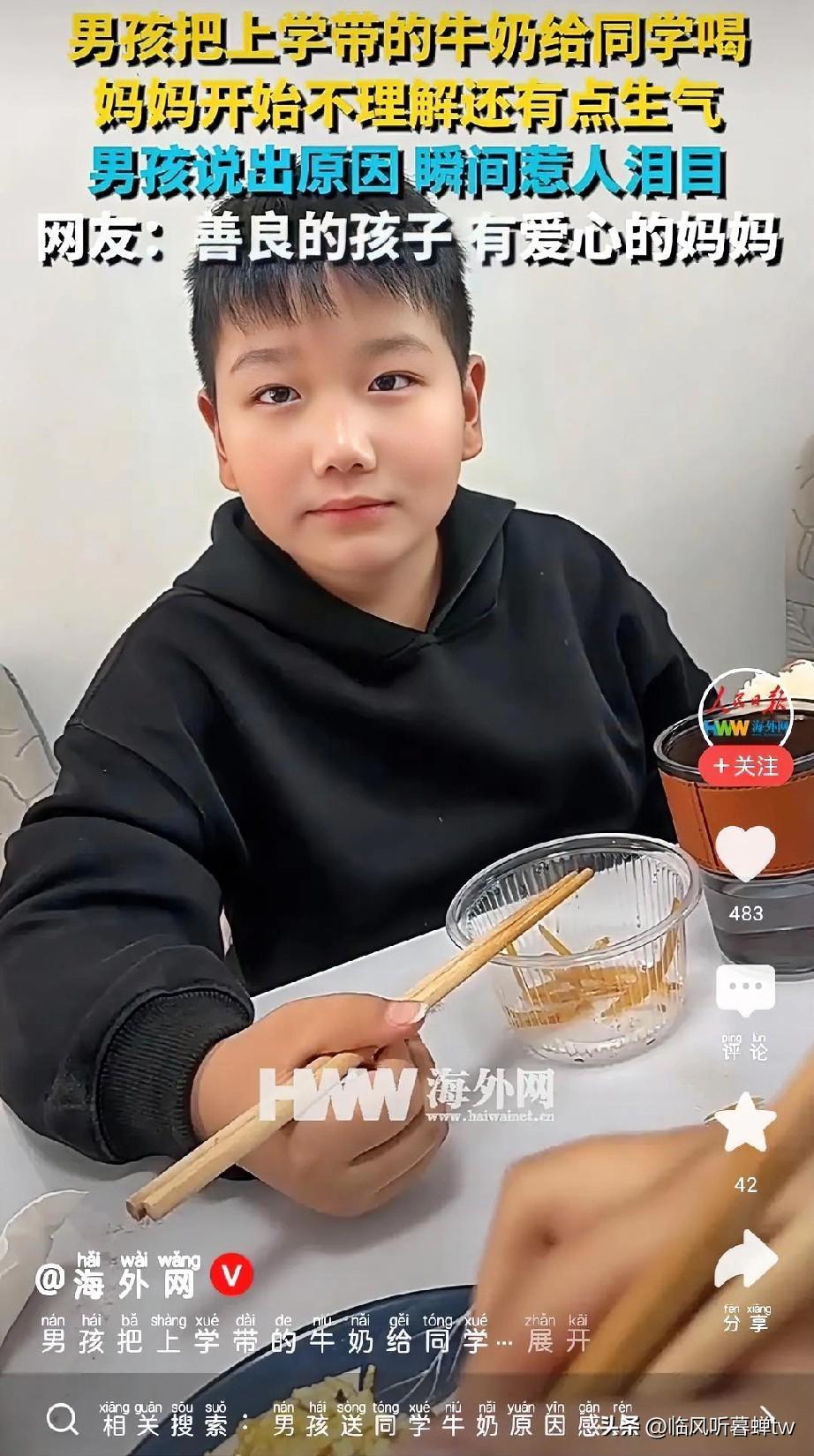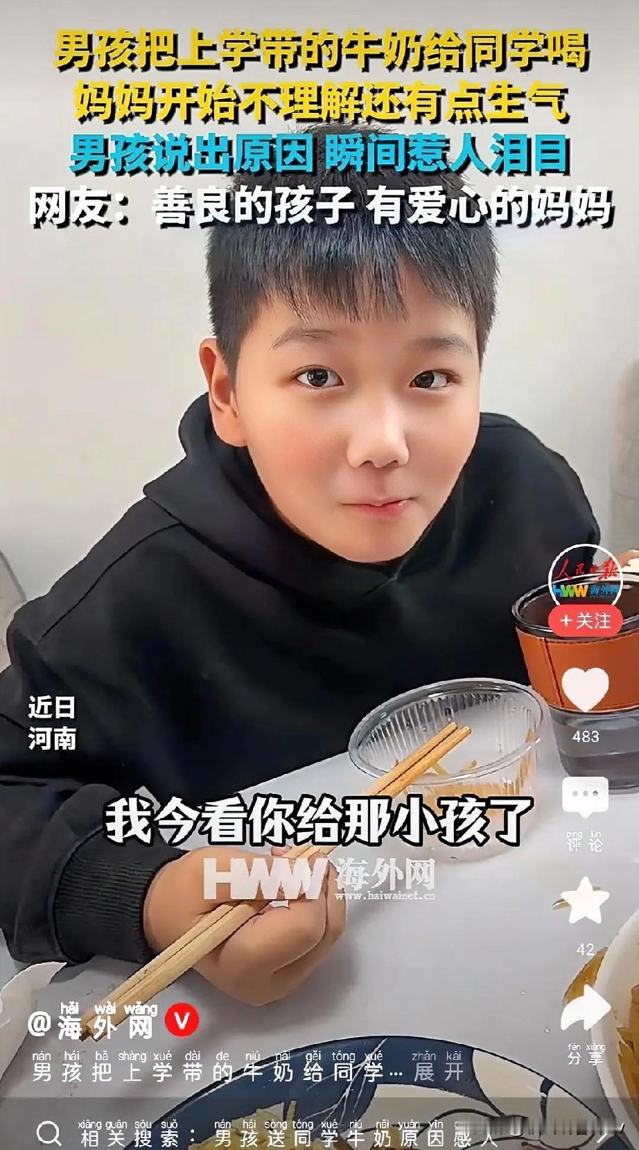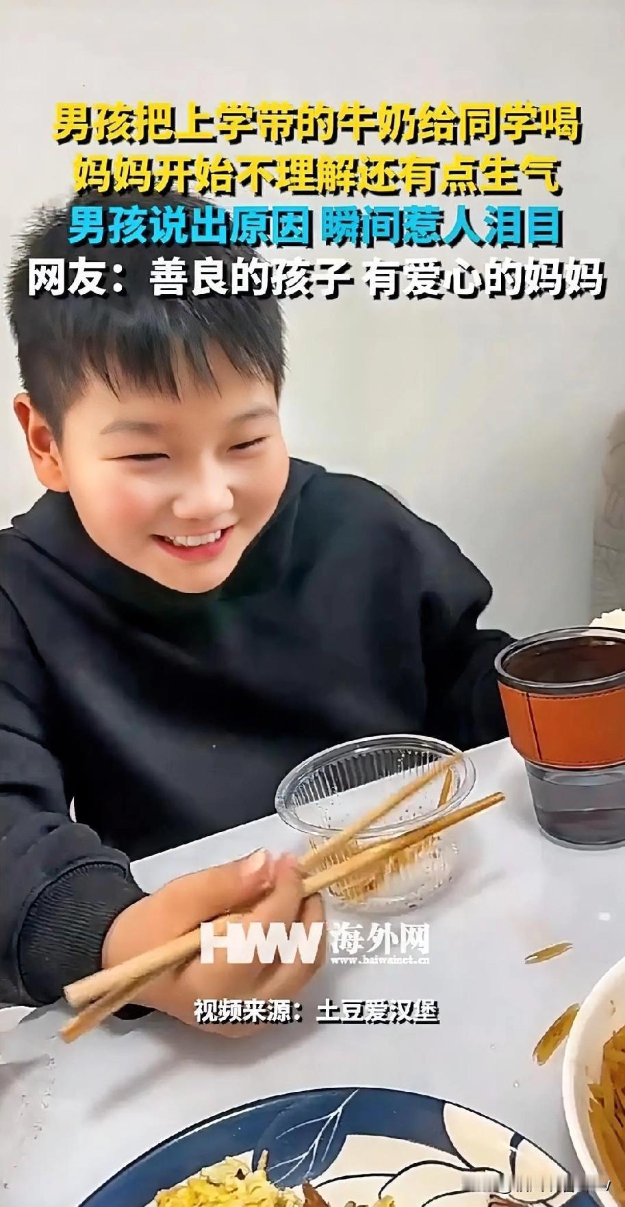 真被这位小男孩给暖到了!河南一位妈妈发现,给儿子补营养的牛奶,他从没自己喝过,全偷偷送给了同学。妈妈忍不住念叨:“他不会让自己妈买吗?非要喝你的!” 男孩乐呵呵回了五个字:“他没有妈妈。” 简单的一句话,让妈妈所有的不满瞬间消散,愣在原地半天没出声。 妈妈连忙改口:“那下回拿两盒,你俩一人一盒,你也得补营养。” 没想到男孩眼睛一亮,带着期盼追问:“那我拿三盒成不?” “为啥要多拿一盒?” 妈妈满脸疑惑,男孩的回答让空气静了几秒:“他还有个小妹,牛奶他自己都不舍得喝,全让给妹妹了。” 妈妈的声音瞬间带上哽咽,连说三个“中”。孩子的善良从不是刻意为之,而是被家庭温暖滋养出的本能,是看见他人难处时的自然共情。 你被这个小男孩的细心暖到了吗?你身边有过类似的孩童暖心瞬间吗?来评论区分享~ 河南暖心男孩 暖心男童 青少年营养牛奶 青少年牛奶