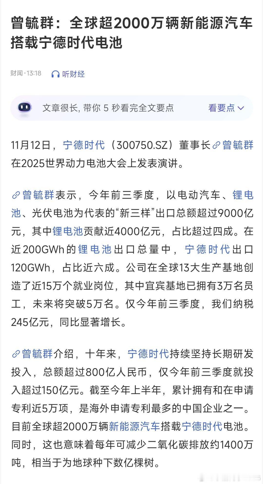 曾毓群:全球超2000万辆新能源汽车,搭载宁德时代电池。