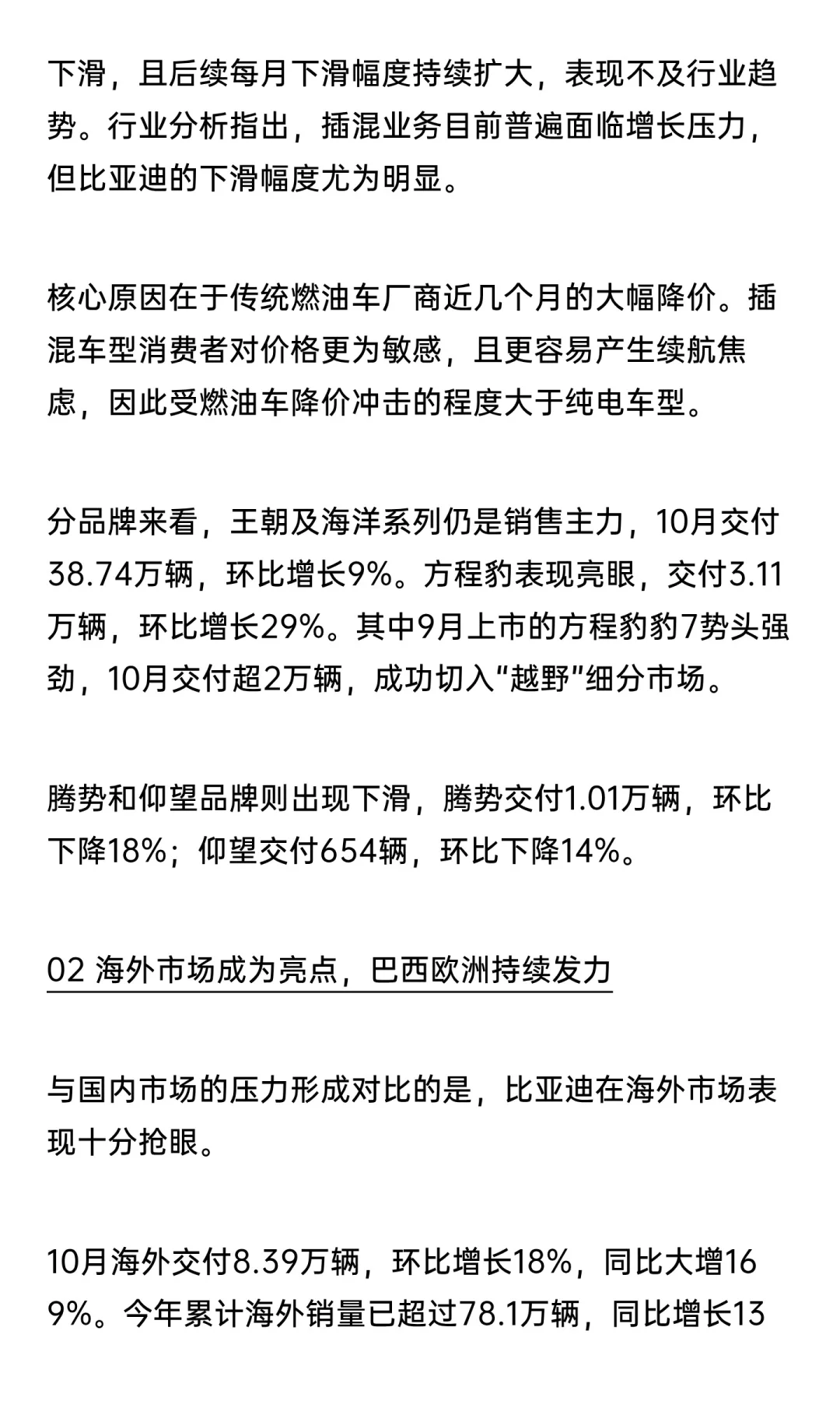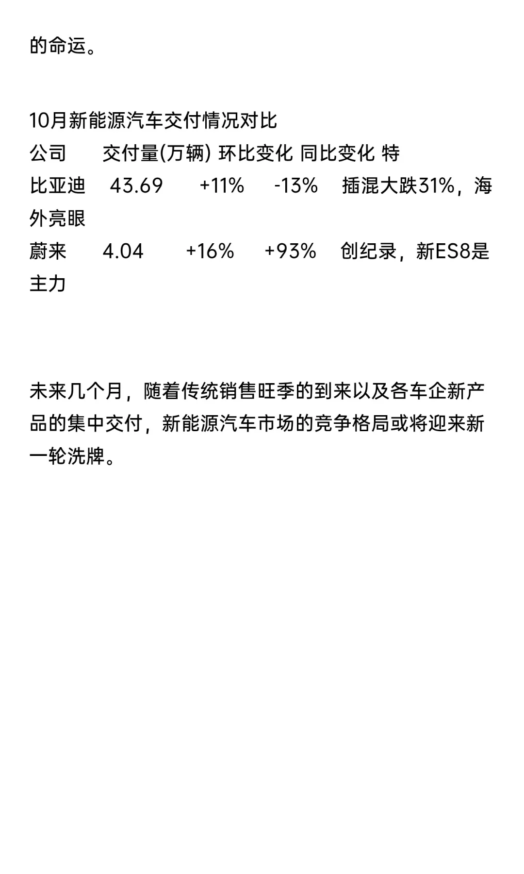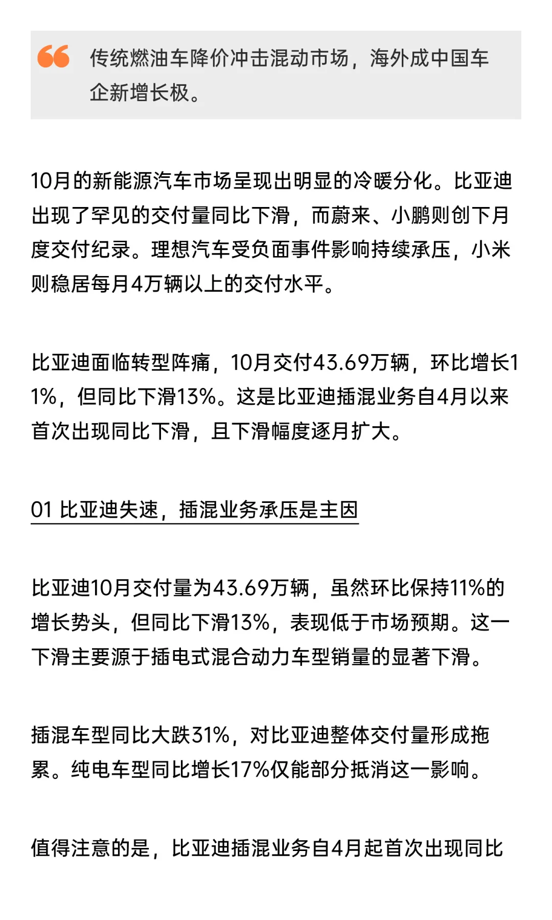 10月新能源车市分化加剧!比亚迪交付量同比
