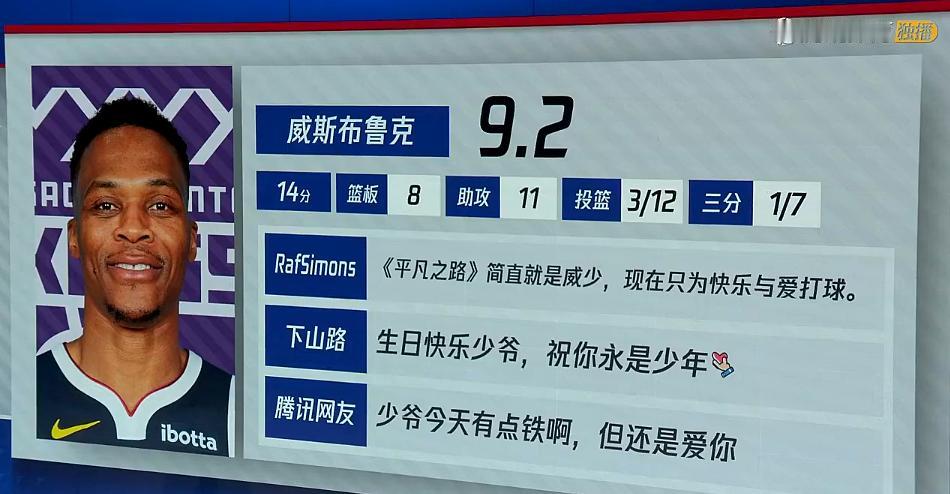 还有爱——威少12中3,生日夜腾讯网友打9.2分! 14+8+11(12中3,3分7中1),除了3分差点其他没毛病。 首发的施罗德又迷失,3中0砍0+0+3失误。对比下,威少这9.2不过分哈哈。 克里斯蒂为啥非要改首发,大家打得都不爽。