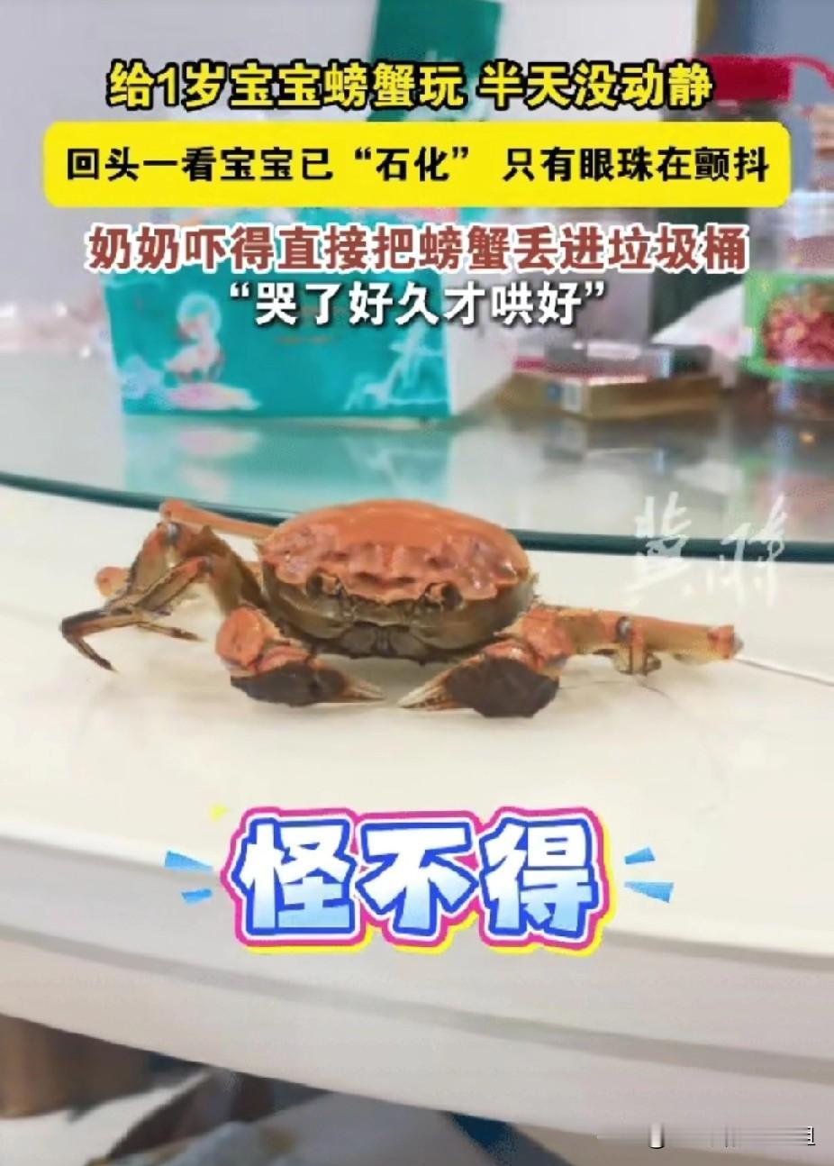 太可怕了!安徽一女子把煮熟螃蟹给宝宝玩,没想到宝宝一直盯着螃蟹看,半天都没有动过,女子就好奇就看了一眼宝宝发现宝宝这眼睛在不停颤抖,接下来发生的事情让女子感到后怕。 奶奶这时候从屋里出来,一眼就瞧见孩子不对劲——小家伙拳头攥得死紧,全身僵住,眼睛抖得厉害。她立马把螃蟹扫进垃圾桶,一把将孩子搂进怀里。孩子在奶奶怀里哇的一声哭出来,那小身子还在不停地打哆嗦,这场面当妈的看了心里直发毛。 小宝宝眼里看到的螃蟹,跟咱们大人看到的压根不是一回事。咱们觉得是盘菜,孩子可能觉得是个张牙舞爪的“活物”。煮熟了的螃蟹眼睛还是乌黑发亮的,直勾勾地“盯”着人,宝宝哪见过这个阵势,直接被吓懵了。小娃娃的神经系统还没长好,遇到特别强烈的视觉刺激,就容易出现这种“吓僵”的反应,医学上管这叫“视觉惊吓反射”。就像有的孩子怕洋娃娃,有的怕大气球,真不是孩子娇气,是他们的小脑袋在启动自我保护。 孩子眼睛不停颤抖,除了害怕,也可能是因为神经系统还没发育完善,或者当时眼睛太累了。要是这种情况经常出现,还得留心是不是缺钙或者其他问题,必要时得去看看医生。当爸妈的容易犯一个错,就是用自己的眼光去衡量孩子的世界。你觉得好玩新奇的,孩子可能觉得恐怖。网上不少家长都干过类似的事,拿个面具逗孩子,结果把孩子吓得哭到喘不过气,这都是没站在孩子的角度想问题。 这件事也给所有家长提了个醒,给孩子选玩具或者接触新事物,得多用他们的视角去看看。那个煮好的螃蟹,在宝宝看来可能就是个大蜘蛛一样的怪物。孩子不会说话,害怕了只能靠身体反应来表达,咱们得学会看懂这些信号。幸好这次奶奶及时发现,要是长时间没人管,真不知道会给孩子留下多大的心理阴影。 各位读者你们怎么看?欢迎在评论区讨论。