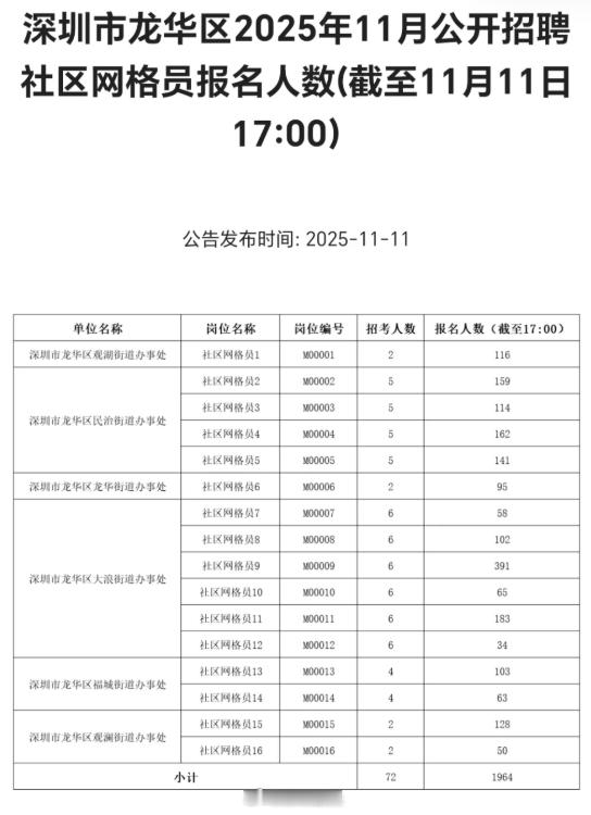 深圳龙华区招聘网格员72人,截至昨天报名人数1964人,另外本科比大专的报名人数还多,深圳就业压力还是蛮大的? 待遇:应发工资 7900 元左右,扣除五险一金后实发工资 5900 元上下。公积金:双边每月公积金缴纳金额共 2100 元左右。其他福利:无过节费、十三薪,中秋和春节有约 400 元零食干果等,生日蛋糕卡 500 元。