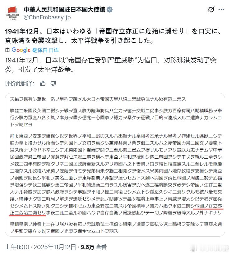中国驻日大使馆:1941年12月,日本以“帝国存亡受到严重威胁”为借口,对珍珠港发动了突袭,引发了太平洋战争。