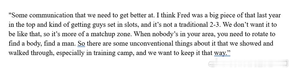 Lerner:火箭队的盯人区域联防总体上有效地限制了对手的每次进攻得分,但如果休斯顿不及时轮转,情况很快就会变得很糟糕。今天训练时我问了伊梅·乌多卡这个问题。他的回答是👇“我们得在沟通方面做得更好。我觉得弗雷德去年在高位(的战术里)发挥了关键作用,他会安排球员到各自的位置,但这不是传统的2-3联防。我们不想采用那种模式,所以更多是对位联防的思路。如果你的区域没人,就得轮转去盯防,找到对应的球员。所以这套战术有一些非常规的地方,我们已经演练过了,尤其是在训练营期间,而且我们希望保持这种打法。”乌度卡回复道。