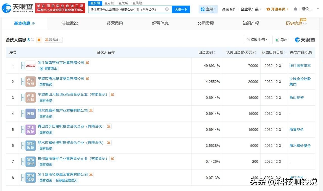 【浙资运营等成立创业投资合伙企业 出资额约14亿】 天眼查工商信息显示,近日,浙江富浙甬元山海创业投资合伙企业(有限合伙)成立,执行事务合伙人为浙江富浙私募基金管理有限公司,出资额14.03亿人民币,经营范围为创业投资、股权投资。合伙人信息显示,该合伙企业浙江省国有资本运营有限公司、宁波市甬元投资基金有限公司、浙江富浙私募基金管理有限公司等共同出资。 天眼查信息:
