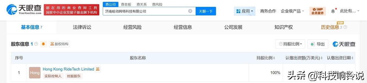 【哈啰出行在济南成立网络科技公司 注册资本3000万美元】 天眼查工商信息显示,近日,济南哈动网络科技有限公司成立,法定代表人为王天流,注册资本3000万美元,经营范围含网络与信息安全软件开发、物联网应用服务、物联网技术服务、信息系统集成服务、软件开发、互联网销售、票务代理服务、酒店管理、商务代理代办服务等。股东信息显示,该公司由哈啰出行旗下Hong Kong RideTech Limited全资持股。 天眼查信息: