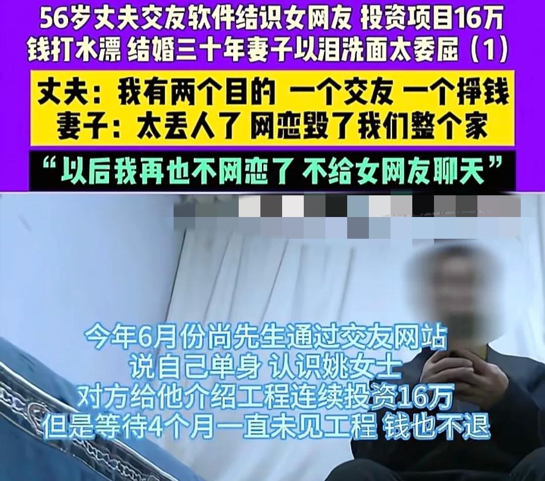 河南洛阳,56岁男子与女网友相约线下见面,花16.5万元投资女网友口中的“夸桥梁工程”。万万没想到,4个月后男子要求退款,女网友:“你在拉个人过来不就有钱了!”太可恶! 56岁男子尚二强(化名),在网上认识了一名女子。为了与女子线下见面,尚二强跋涉千里跑到长沙与女网友刘珍(见面)。 尚二强自称单身,到了长沙后,刘珍非常热情的招待尚二强,在朋友面前还说“这是我们家老尚。” 后来刘珍告诉尚二强,她表弟手里有个跨桥梁工程。 尚二强一听没想到刘珍还是个大老板,心里暗自高兴,这次赚大了,不仅找到女友还能大赚一笔。 于是尚二强悄悄将家里所有积蓄7万元转给了刘珍的表弟,称他要一起投资。这还不够,尚二强又贷款9.5万转给了刘珍表弟。 可是4个月后,尚二强根本没有看见什么工程不工程,他发现自己上当受骗了。便要求刘珍退钱,万万没想到,刘珍却说:退什么钱?你在拉个人头过来,这钱不就有了? 这事被尚二强妻子知道后,气不打一处来。7万元那可是两口子攒了一辈子才攒下那么点,这还不够,还贷款9.5万,她们要拿什么还? 而刘珍这边说什么也不退钱。尚二强说:“我以后再也不网恋了,再也不跟女网友聊天了”。 万般无奈之下,尚二强选择了报警。 那么尚二强这钱还能追回来吗?