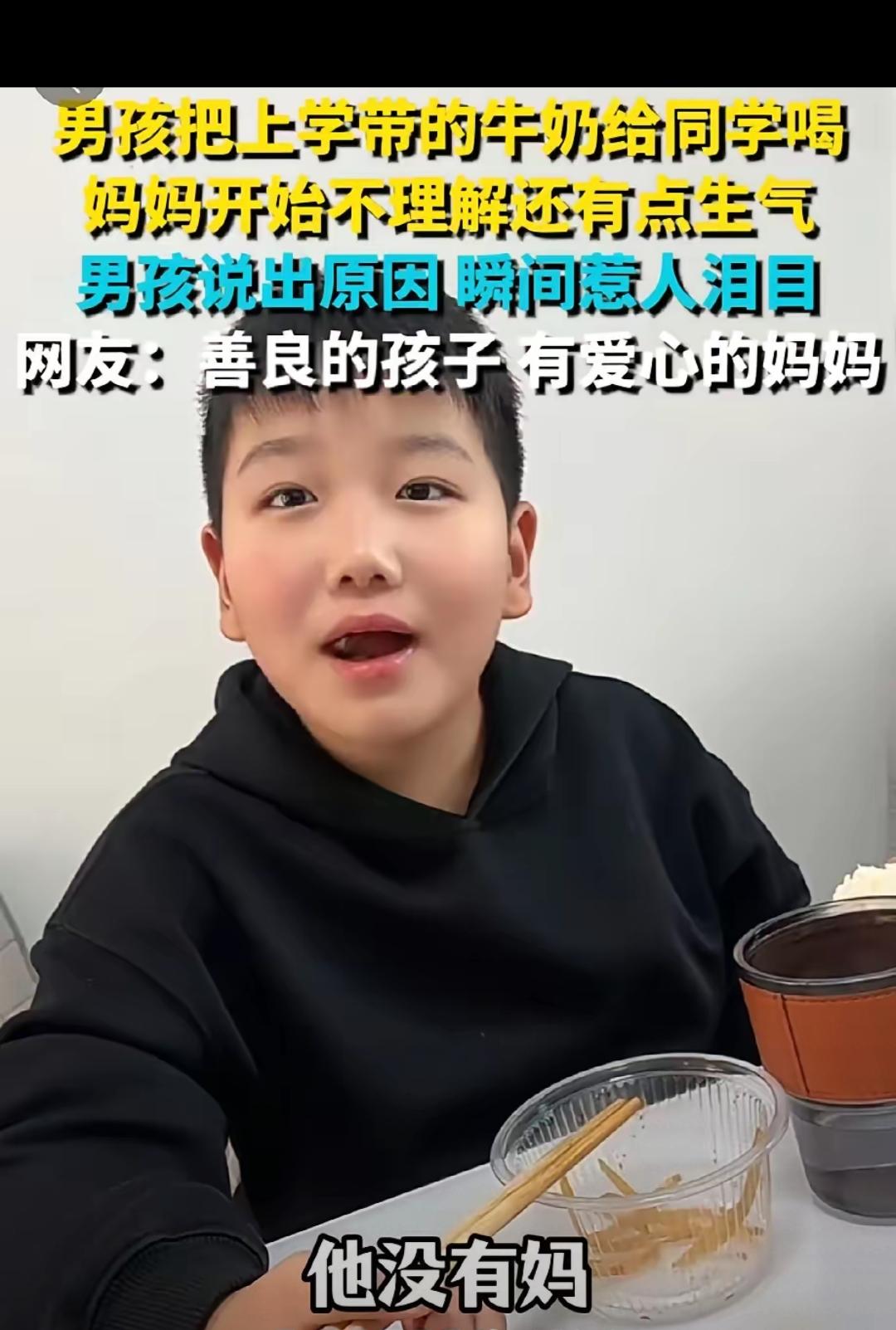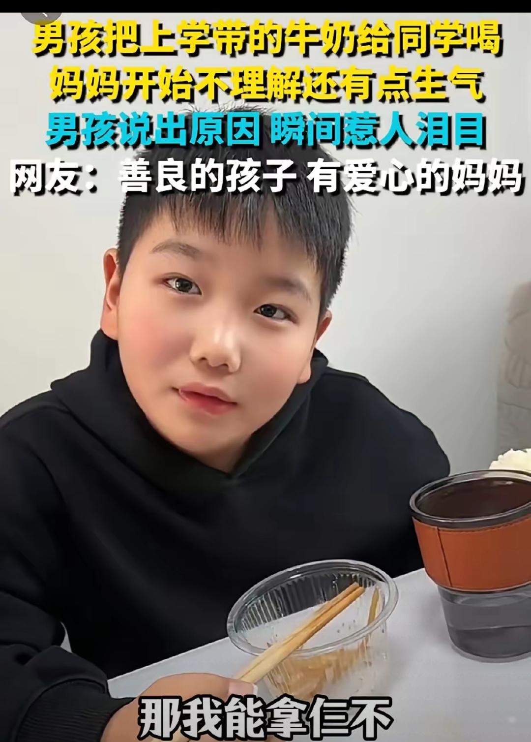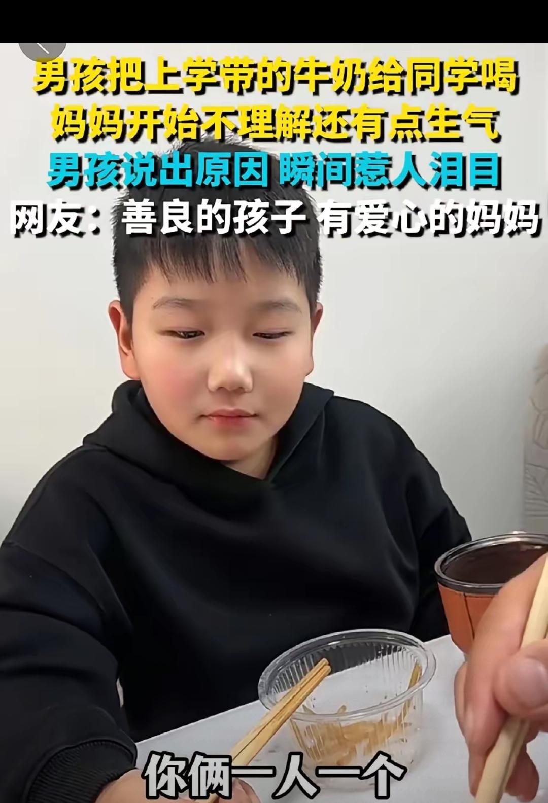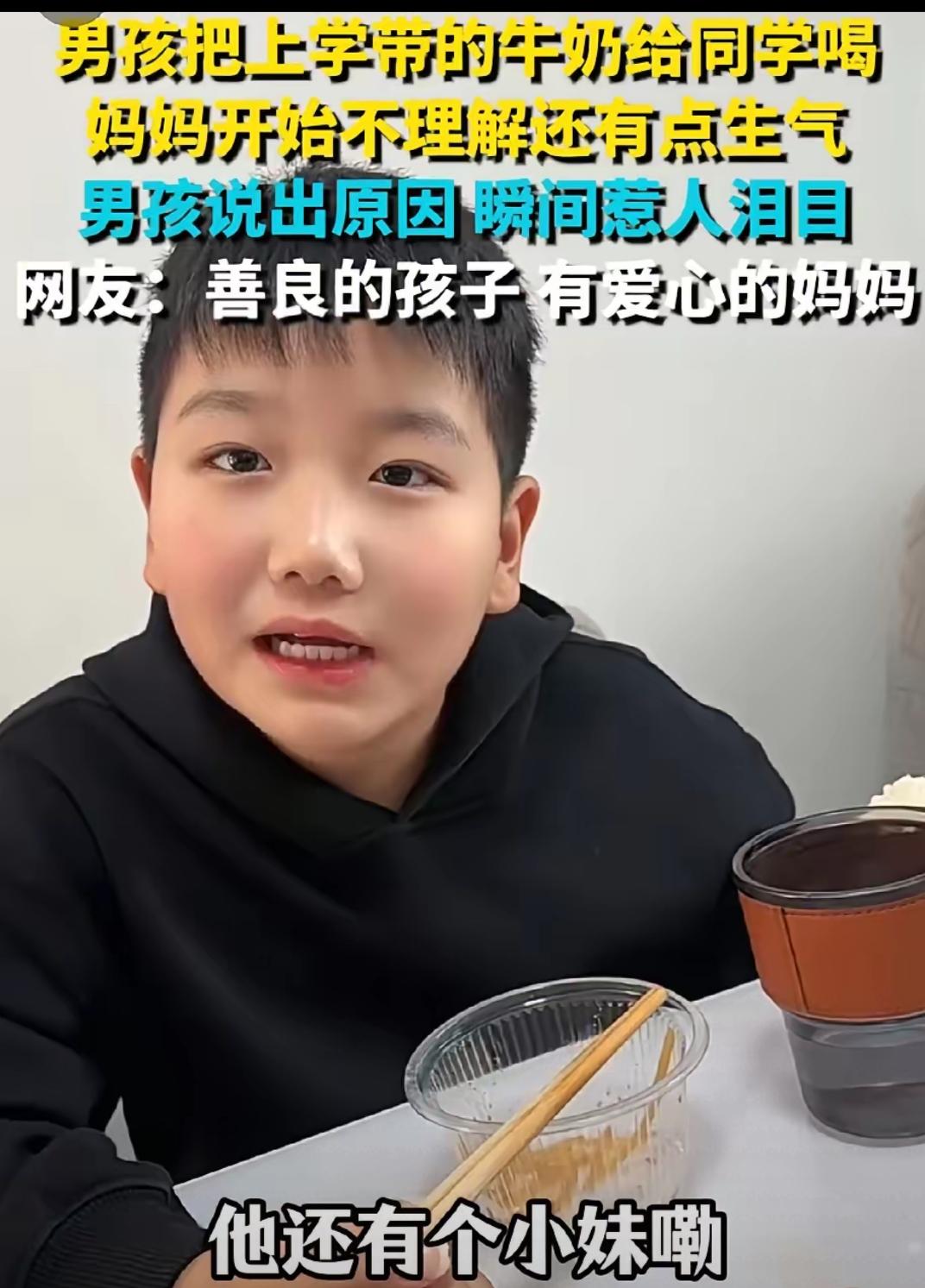 谁懂啊!刷到这个视频直接破防了!男孩天天带的牛奶自己一口不碰,全分给同学和他妹妹,妈妈发现后又气又纳闷,追问半天才听到那句戳心的“他没有妈”。 就五个字,瞬间浇灭了妈妈的火气 这小孩是个善良讲义气的孩子,这样的小孩福运深厚,这也和家庭教育有关,父母也是善良之人。 这个小男孩真的超级棒,再仔细端详一下这孩子的面相、尤其是那一双清澈明亮的眼眸、端正的五官、还有两耳垂真的是大富大贵之人的福相呀!更重要的是孩子有着一颗真诚善良通情义的心灵! 河南娃太暖了!妈妈给带的牛奶全偷偷分给没妈的同学,还想着同学的小妹要带三瓶。没有复杂心思,只剩纯粹善意,妈妈不指责还全力支持,这才是最好的教育!有同理心又懂事的娃,未来必成大器!