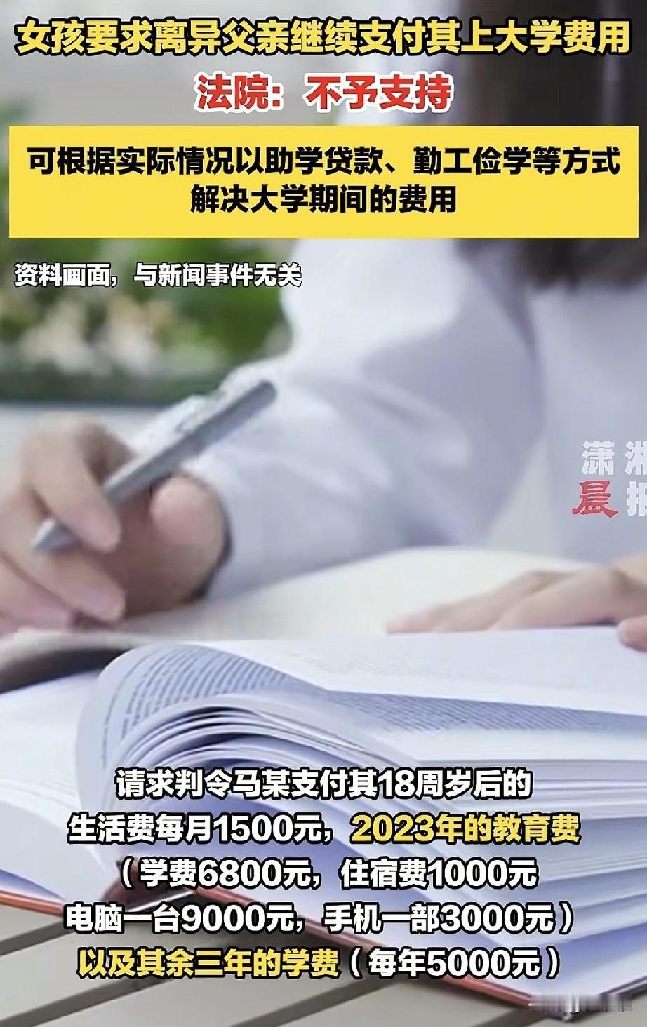 “没完啦!”女孩父母离婚后跟随母亲生活,而每月收入只有四千块钱的父亲,却雷打不动的给她按月支付2000元生活费,并承担了她大学四年的所有费用,大学毕业后她继续攻读研究生,父亲给她支付了读研第一年的学费,等到第二年需要缴费时父亲拒绝继续支付,父亲说:你都23岁了已经成年,有独立生活的能力了,而我年纪越来越大,挣钱也越来越不容易,往后的学费你自己想办法吧!随后女孩又多次给父亲讨要学费,遭到拒绝后,她一纸诉状将父亲告上法庭,要求父亲继续支付她读研期间的学费和生活费。法院审理后明确指出:父母的法定抚养义务只针对未成年子女,或者是已经成年,但没有生活自理能力的子女。而本案中这个女孩已经年满23周岁,又在接受高等教育,显然是有生活自理能力的。法院最终驳回了女孩的所有诉讼要求! 我想说:这位父亲可以说已经是蜡炬成灰泪始干了,每月自己挣4000,给女儿2000生活费,还要额外负担学费,可想而知他已经尽了他最大的能力去供养女儿。到头来女儿还要把他告上法庭,这不知道她的高等教育是怎么被教育的!