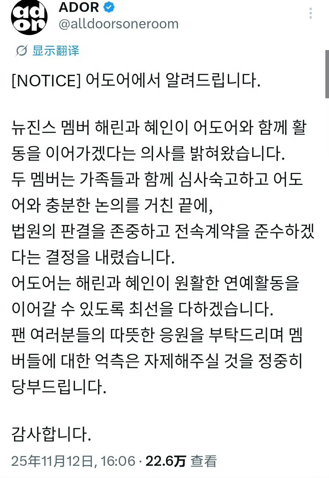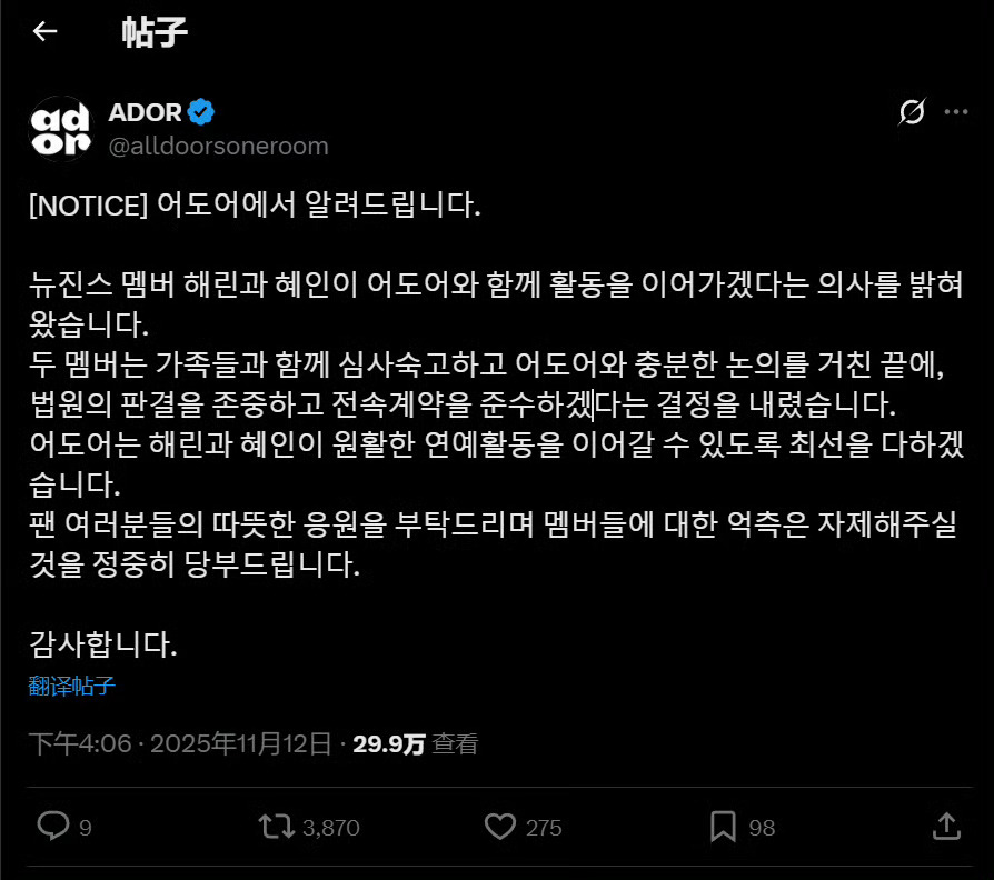 NewJeans成员Haerin(姜谐潾)和Hyein(李惠仁)已宣布回归所属公司ADOR继续活动,那其他三个人呢?这是在致敬东方神起的3+2吗