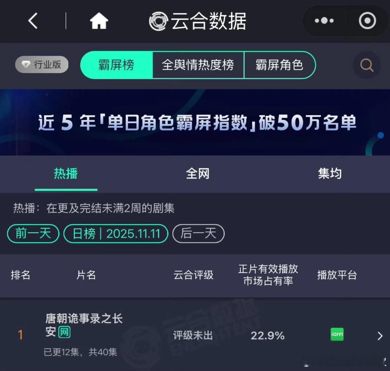 11月11日云合播放占比唐朝诡事录之长安22.9%横盘了,随着下面几部剧的逐渐
