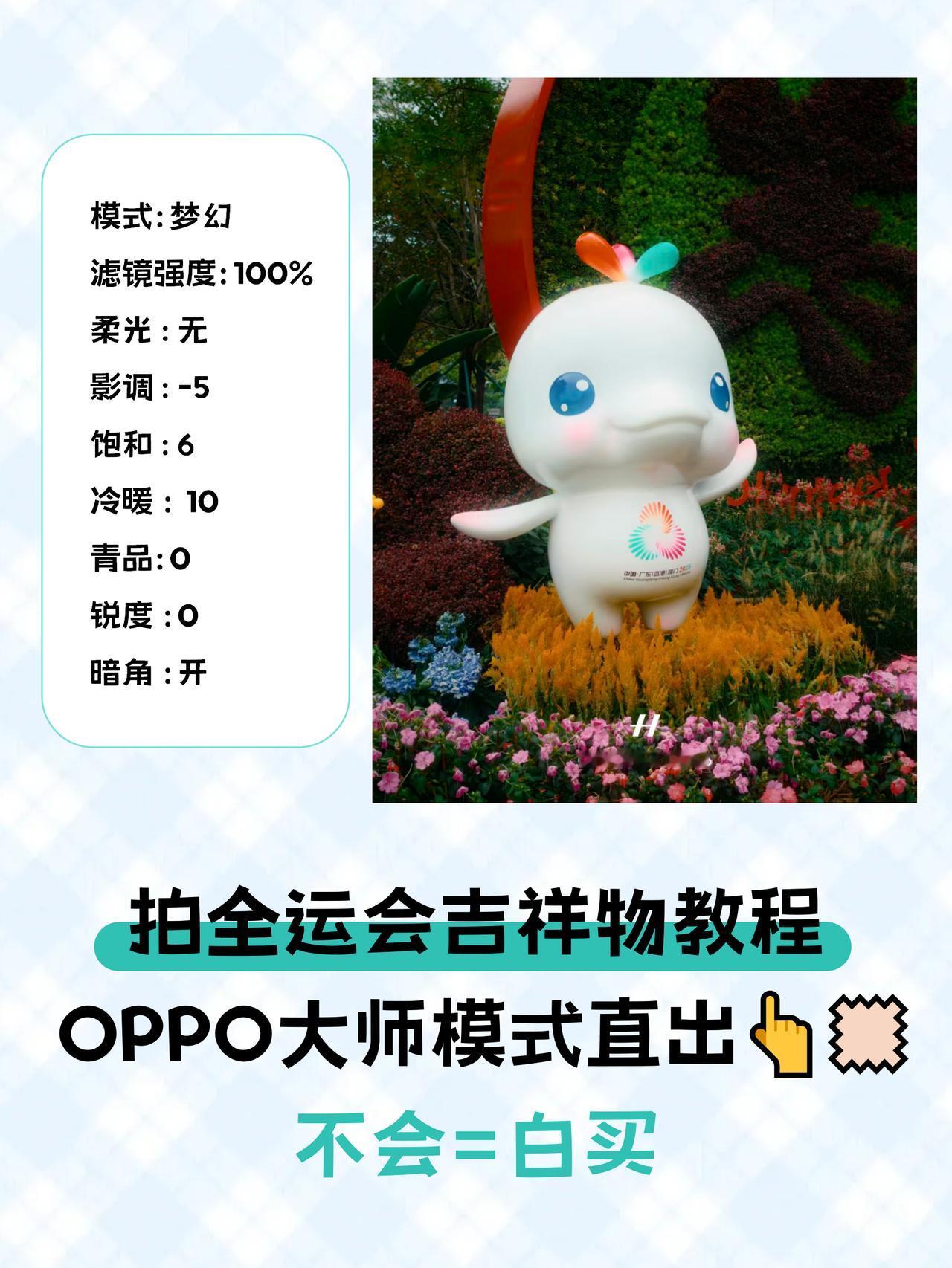 全运会吉祥物:建议用大师模式拍 这几天去大湾区看全运会,真的太燃了! 而且到处都是“大湾🐓”,还有好多花花 完全忍不住想拍拍拍📸 所以掏出了我新入的OPPO Find X9 Pro,研究了下大师模式,成片意外惊艳! 我的参数分享给大家👇 ▪️模式:梦幻,色彩质感很高级(眼里会发光☀️的感觉) ▪️滤镜强度:100% ▪️柔光 : 无 ▪️影调 : -5 ▪️饱和 : 6 ▪️冷暖 : 10 ▪️青品:0 ▪️锐度 :0 ▪️暗角 :开 用大师模式这样拍真的巨有氛围感👍 如果拍花花也可以用梦幻滤镜 具体参数可以看图哦✅ 🤔多拍多练,相信你也能用OPPO手机拍出氛围感大片~ 全运会OPPO Find X9