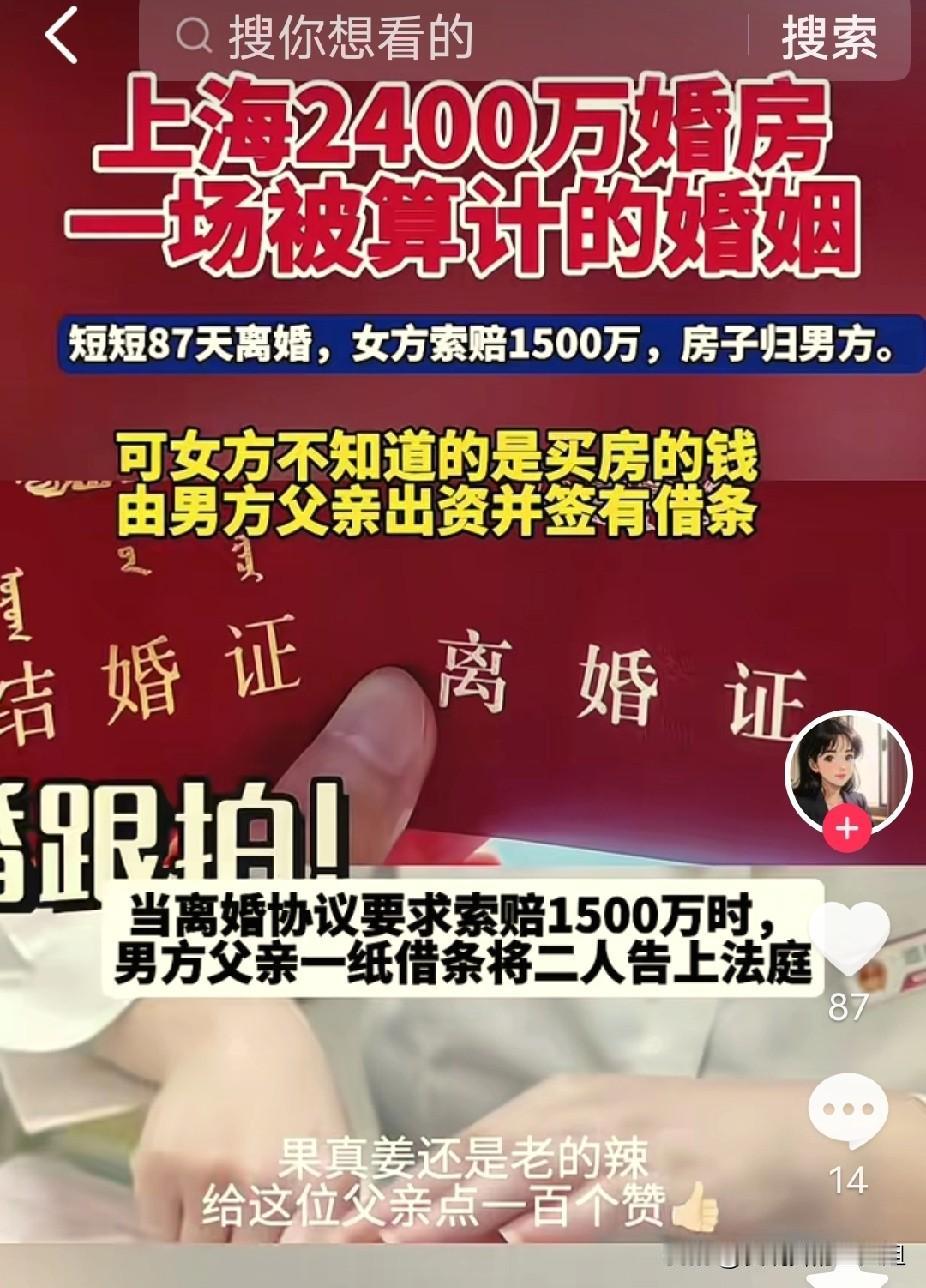 姜还是老的辣!上海,大爷把自己前半辈子的积蓄2400万元全拿出来,给儿子全款买了套婚房,儿子给父亲打了张借条。谁知,婚后刚刚三个月,儿子儿媳竟然离了婚,最离谱的是,离婚协议里,儿子竟然将1500万分给了女方。大爷瞬间懵了,自己省吃俭用一辈子,到头来一大半进了别人腰包,这口气他咽不下,而且他还怀疑,这小两口合起伙来要套他的钱。于是,他仅用一招,就将钱全部追回。 大爷这招真是戳中了要害,他直接拿着儿子写的那张借条去法院起诉了。别看这借条写得简单,在法律上可是实打实的证据,清清楚楚证明了那2400万是借款,不是小两口以为的不用还的赠与。法院一看就明白,这钱的性质是父子间的借贷,儿子儿媳离婚时分掉这笔钱根本不合法。 这事儿给我们提了个醒,父母给子女大手笔出资买房,最好事先白纸黑字写清楚是借还是送。很多老人心疼孩子,掏钱时压根没想过要留凭证,总觉得谈钱伤感情。可万一遇上小两口婚姻不稳,像这位大爷一样,半辈子心血可能就打了水漂。法律上认可这种家庭成员间的借贷关系,关键就在于得像这位大爷一样,保留好借据、转账记录这些铁证。 儿子在离婚协议里把大部分钱分给女方的操作也让人看不懂,这明摆着侵害了老父亲的债权。大爷怀疑小两口联手套钱不是没道理,这种短时间内结婚离婚还处置大额财产的行为,法院审查时会非常谨慎。最终判决儿子儿媳共同承担还款责任,等于是法律帮大爷戳穿了可能存在的把戏。 老年人对自己积攒的财产拥有完全的处分权,子女不得干涉,更不能以欺骗方式侵占。大爷能追回钱,不仅是法律技术的胜利,更是对老年人财产权益的坚决保护。它告诉所有人,即便是亲生子女,也不能随意将父母的付出视为理所当然。 这件事也算给所有家庭上了一课,涉及大额经济往来,亲情归亲情,规则归规则。事先明确资金性质,既能避免日后纷争,也是对亲情的另一种保护。千万别等撕破脸了,才后悔当初没好意思写张条子。 各位读者你们怎么看?欢迎在评论区讨论。