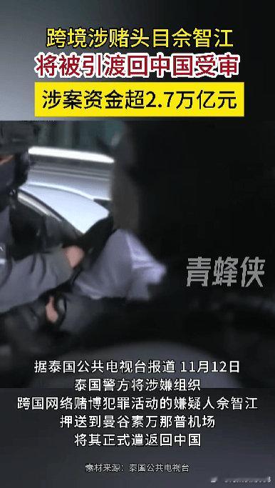 佘智江被押送上飞机,引渡回中国;涉案流动资金超2.7万亿元,曾参与投资开发KK园区------11月12日,据人民日报客户端,当地时间12:45,泰国警方将佘智江押送至曼谷素万那普机场,并于16:20押送上飞机,引渡回中国。此前据环球时报,泰国最高检察院10日宣布,获得柬埔寨国籍的华裔跨境赌诈犯罪集团头目佘智江(又名佘伦凯),将被引渡至中国接受审判。泰国最高检表示,此案充分体现中泰两国在打击跨国犯罪领域的高效协作和务实行动。泰国《曼谷邮报》11日援引泰国最高检察院的信息称,佘智江的主要罪行是创建和运营239个非法赌博网站,涉案流动资金超12.63万亿泰铢(约合2.77万亿元人民币)。他长期在缅甸妙瓦底KK园区及“亚太新城”开展赌博和电诈活动,通过网络平台诱骗中国公民参与非法交易。据澎湃新闻,公开报道显示,佘智江1982年出生在湖南邵东一个农家,长于桂林城镇。1996年时,他在桂林跟随小姑姑学裁缝,曾换过20多种职业:开农用车、修机动车、推销洗发水、做保安、开按摩店、做直销等,而后旅居柬埔寨,闯荡东南亚淘金。