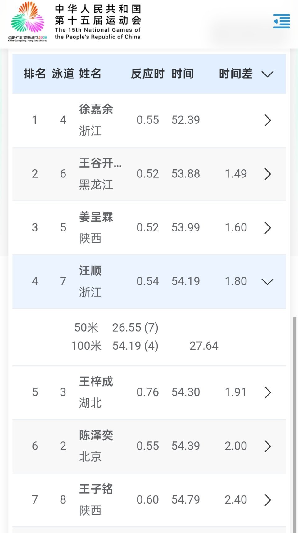 『7784』20251112 深圳十五运会男子100m仰泳泳决赛分段成绩✅分段成绩已出摸摸这个小顺头!