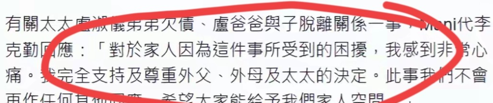 家家都有本难念的经。 李克勤的老丈人和自己的儿子断绝了一切父子关系。原因就是儿子在外面欠债了几千万,全家人被拖累的无力偿还、焦头烂额。 有记者询问李克勤对这件事的看法,他回应说尊重妻子一家人的决定。不知道小舅子卢煜培是因为什么欠账?