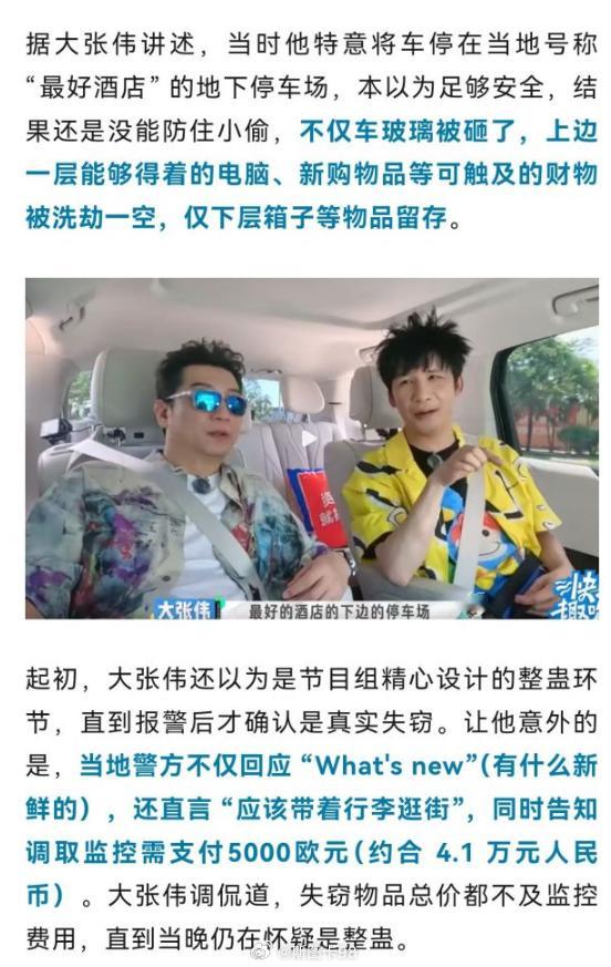 大张伟在荷兰遭到砸车盗窃,车辆内财物被盗,报警找警方要监控被告知要缴费5000欧元(4.1万人民币),还怪他少见多怪