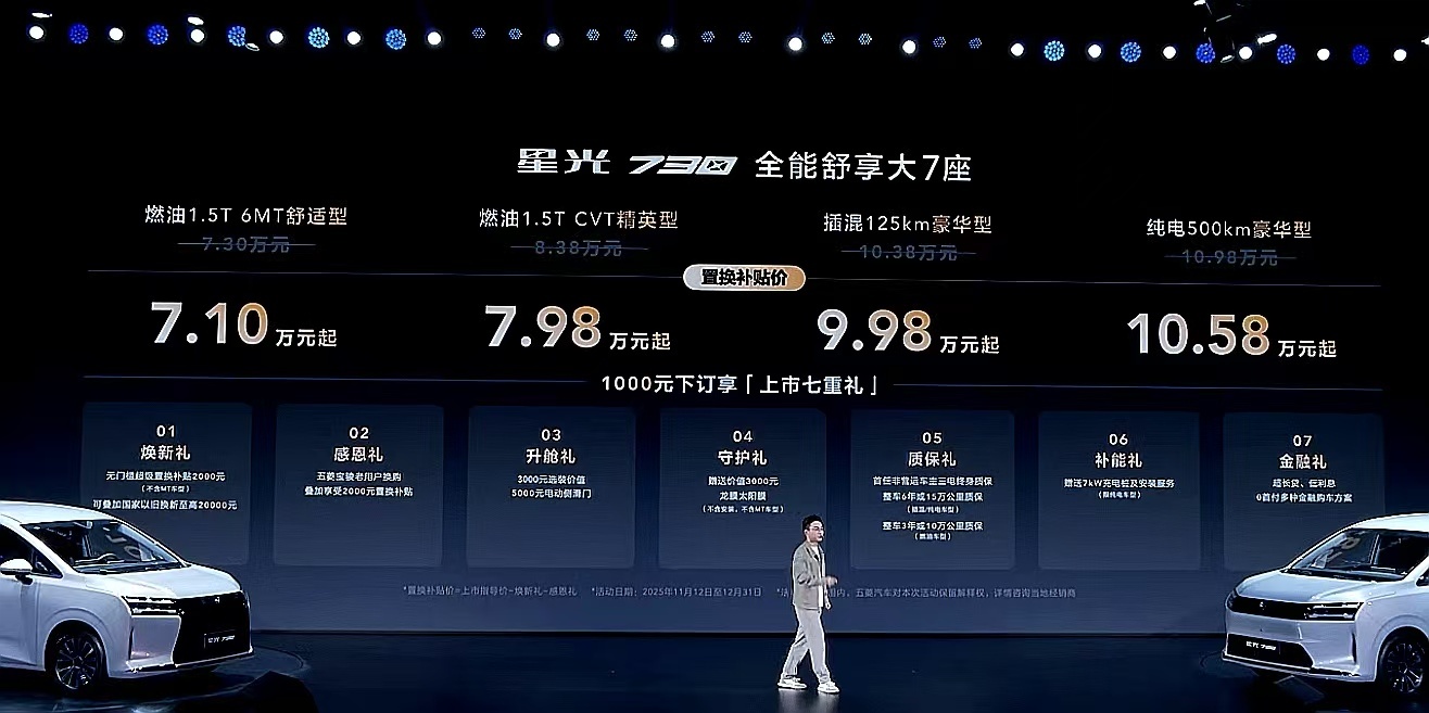 7万出头就能拿下大7座MPV,燃油、插混、纯电三种动力随便挑,想省钱选插混,纯电跑125km通勤不用油;想没续航焦虑选燃油,1.5T动力够劲儿;城里开选纯电,500km续航不用老充电。2910mm轴距坐着敞亮,第三排也能舒舒服服坐成人,后备厢塞得下婴儿车+行李箱,电动侧滑门上下车特方便,全家出游、拉货干活都能扛。7万起买个能装、好开还靠谱的大7座,普通人买车就认这种实在的!