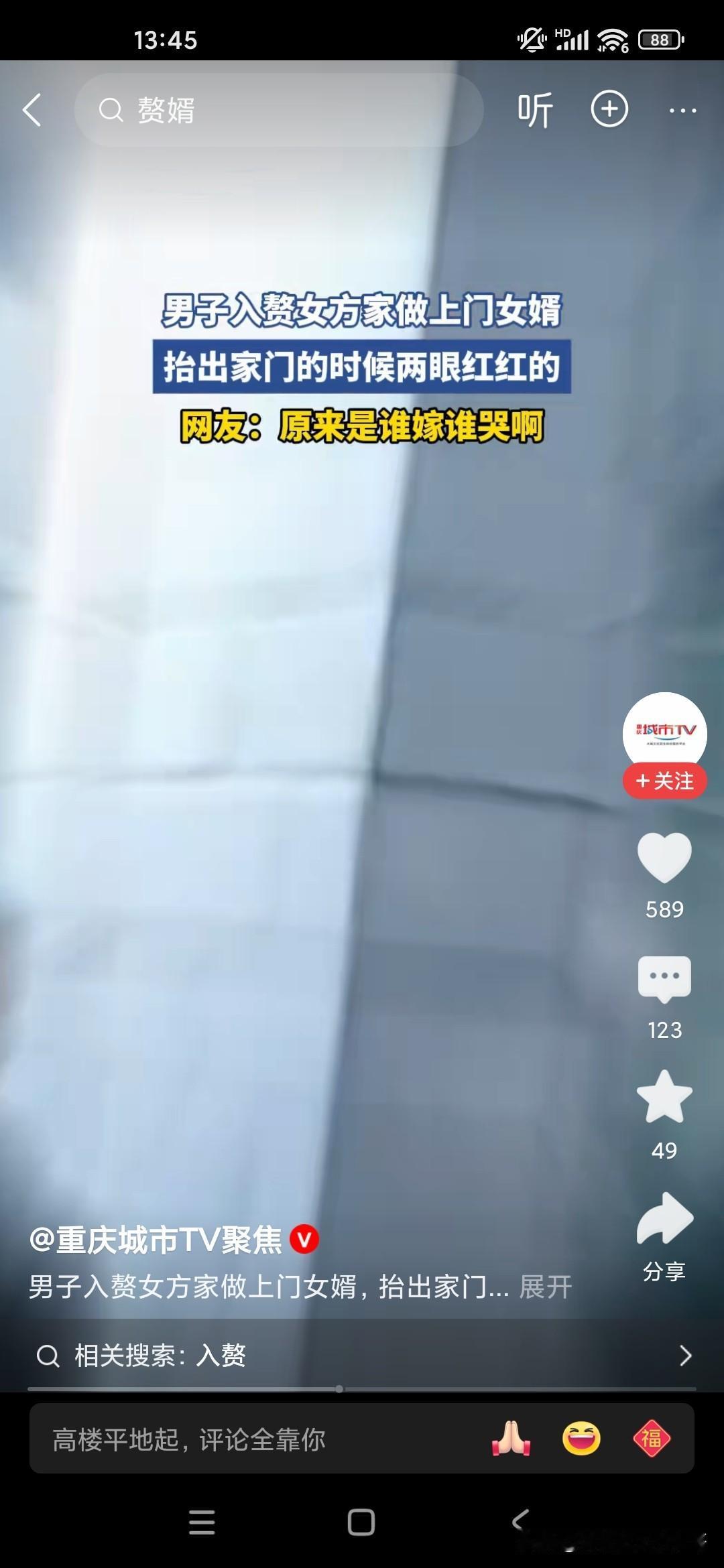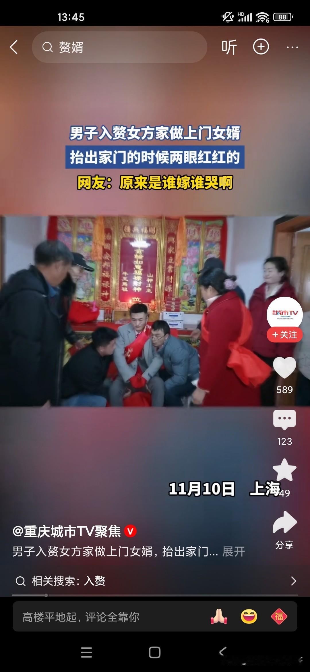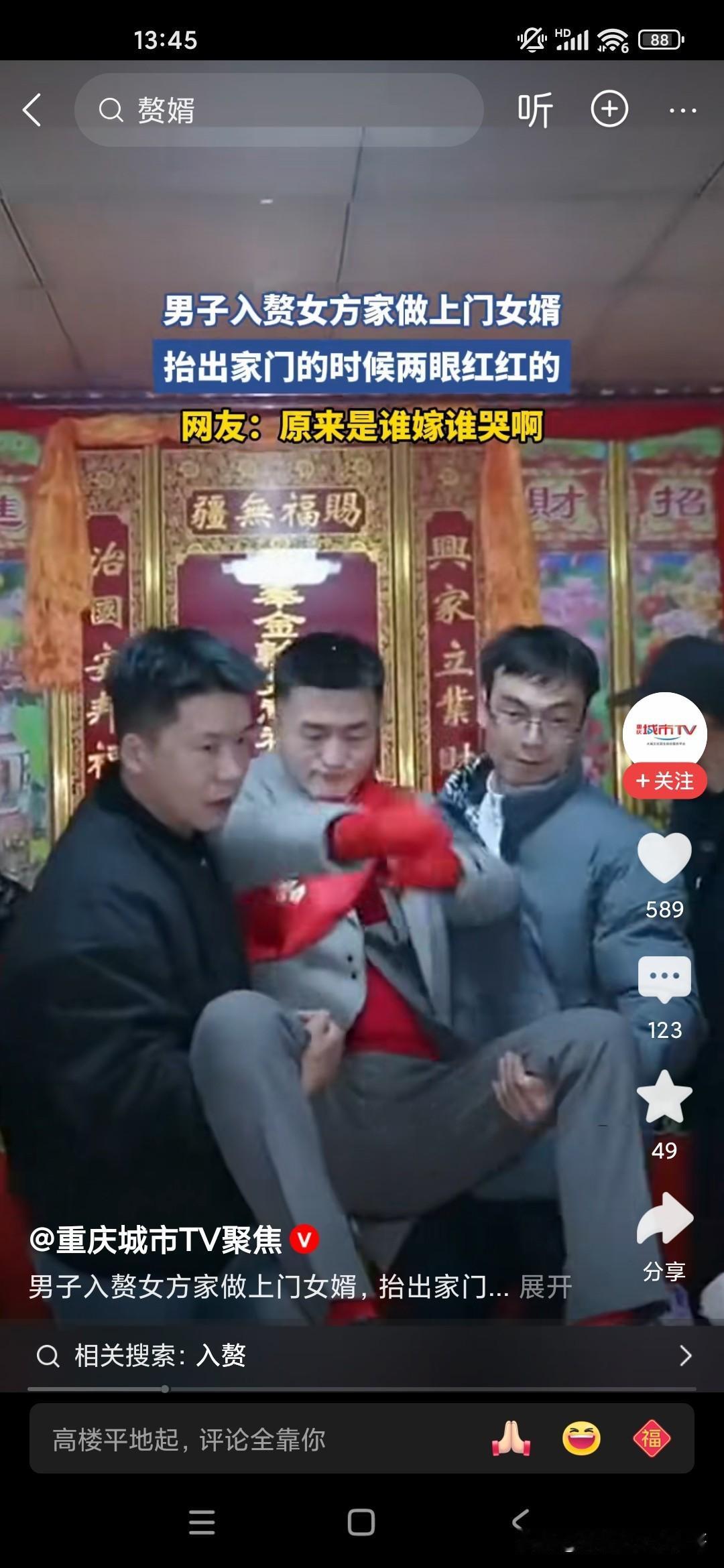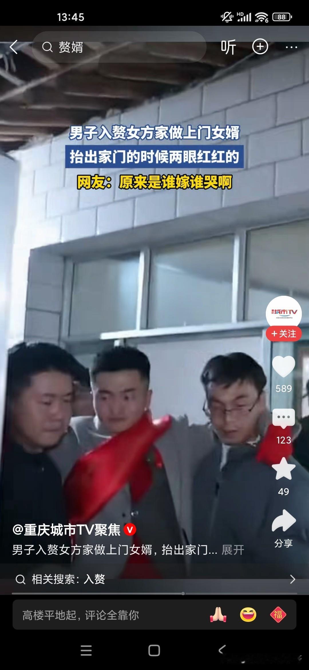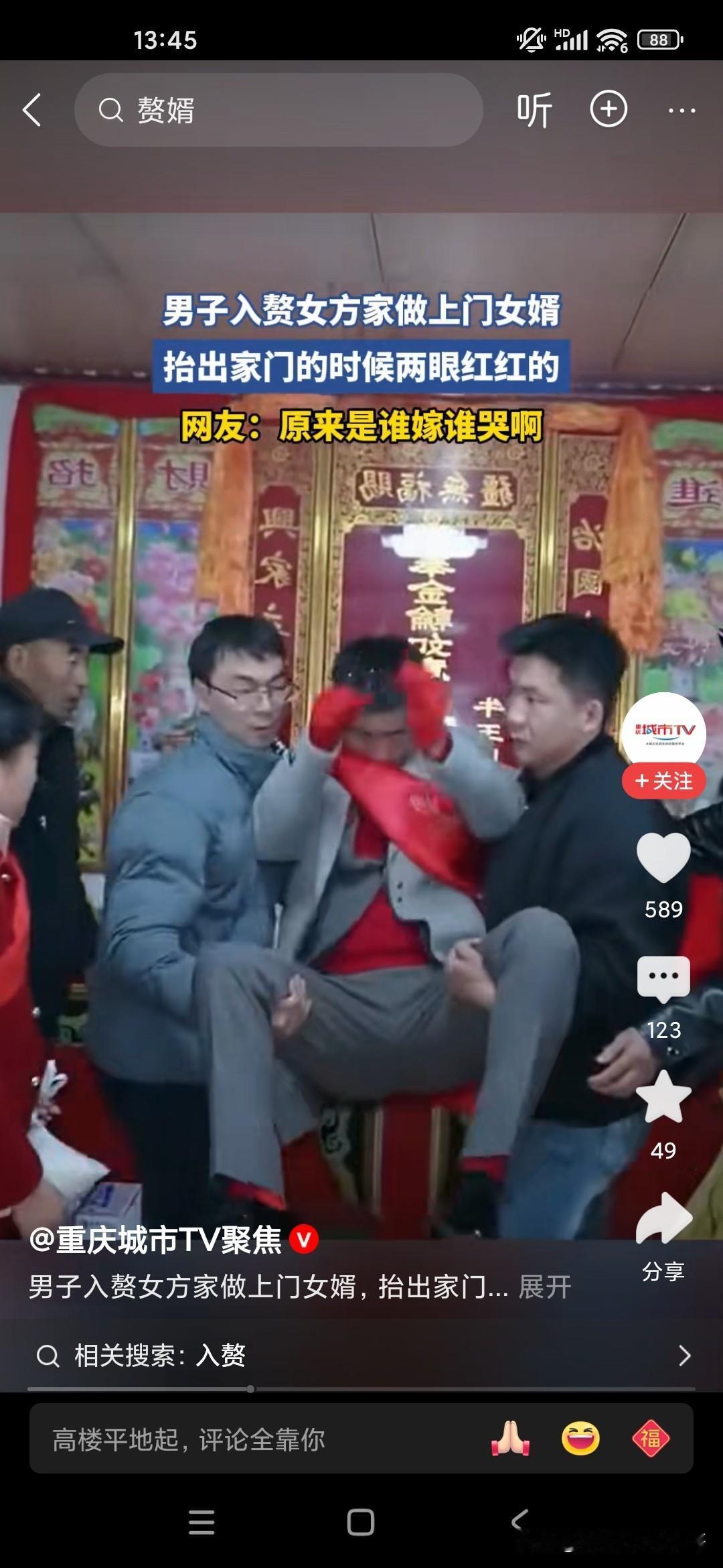我不知道你有没有想做上门女婿的想法,我目前是没有。我们家乡做上门女婿的也有,有的是因为家里太穷了,有的是因为对方女方家给出的条件实在是太诱惑了,虽然他女儿不咋地,但是给高额的彩礼,还有多套房产或者商铺,所以说他只能委屈一下自己的儿子吧。因为在农村,你要想娶媳妇儿需要高额的彩礼的,有的又要求城里有房子的,或者说最起码有自建房的,有的没有这样的条件,为了传宗接代,也为了生活下去,只能入赘,像这位小伙子他也知道,如果一旦做了女婿,可能就没有像娶媳妇儿那样有尊严了,所以他也哭了,但是没有办法,事已至此,已经答应别人了,只能入赘过去了,我们都看过各种各样的电影或电视剧,包括现实当中做女婿是很受委屈的,在女方家是没有什么尊严的!