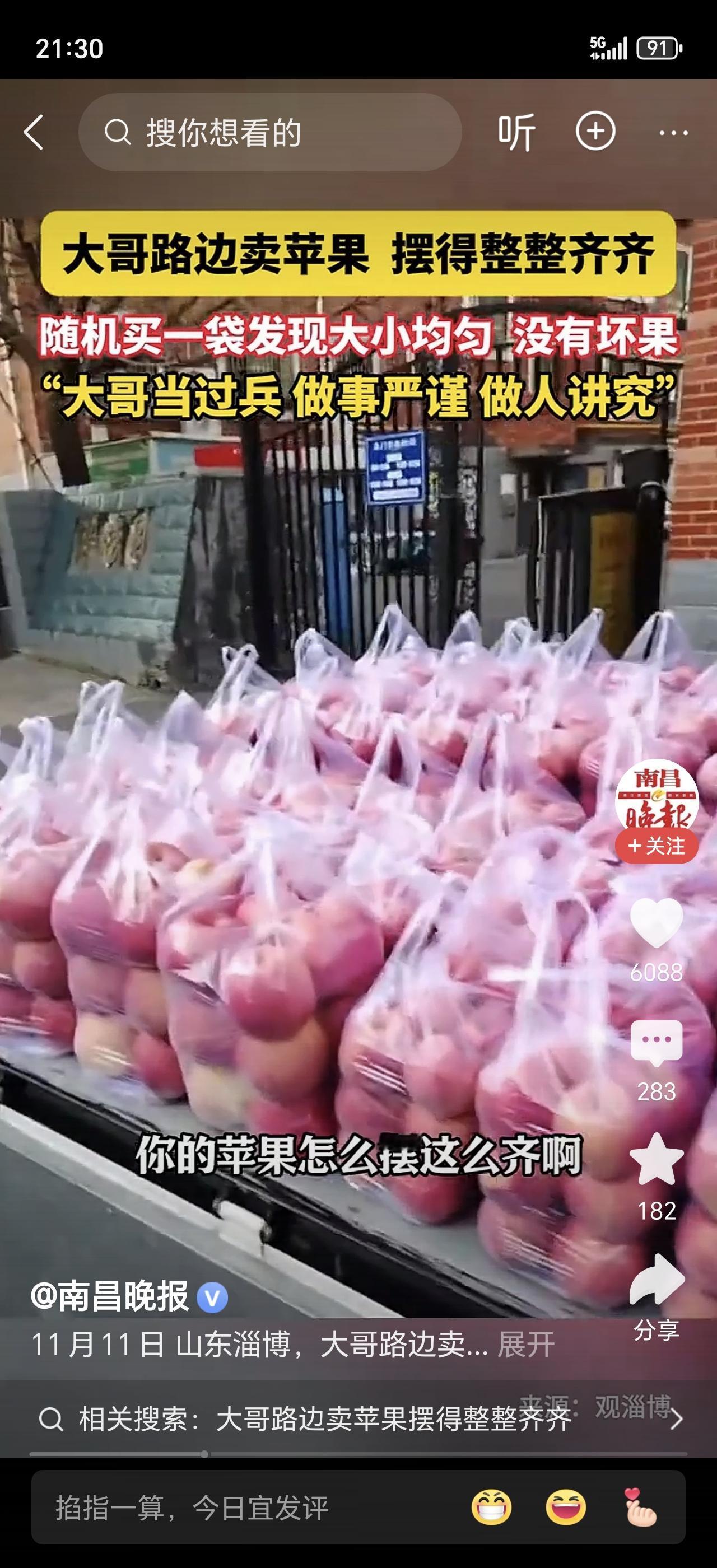 路边卖苹果能卷到啥程度?这位大哥的摊位直接看呆路人——苹果摆得比超市货架还整齐! 一个个红苹果擦得发亮,按大小排成笔直行列,连果蒂朝向都一模一样,远看像块规整的红地毯。问了才知道,大哥每天早到一小时打理,说“东西摆周正,买的人舒心,我卖着也踏实”。 不像有些摊位乱糟糟堆着,大哥这股较真劲儿太圈粉,路过的人不管买不买,都忍不住多看两眼。做生意和做人一样,用心了自然让人好感倍增。 你们遇到过这么讲究的路边摊主吗?会不会因为这份整齐特意多买几斤? 街边水果摊 路边水果摊