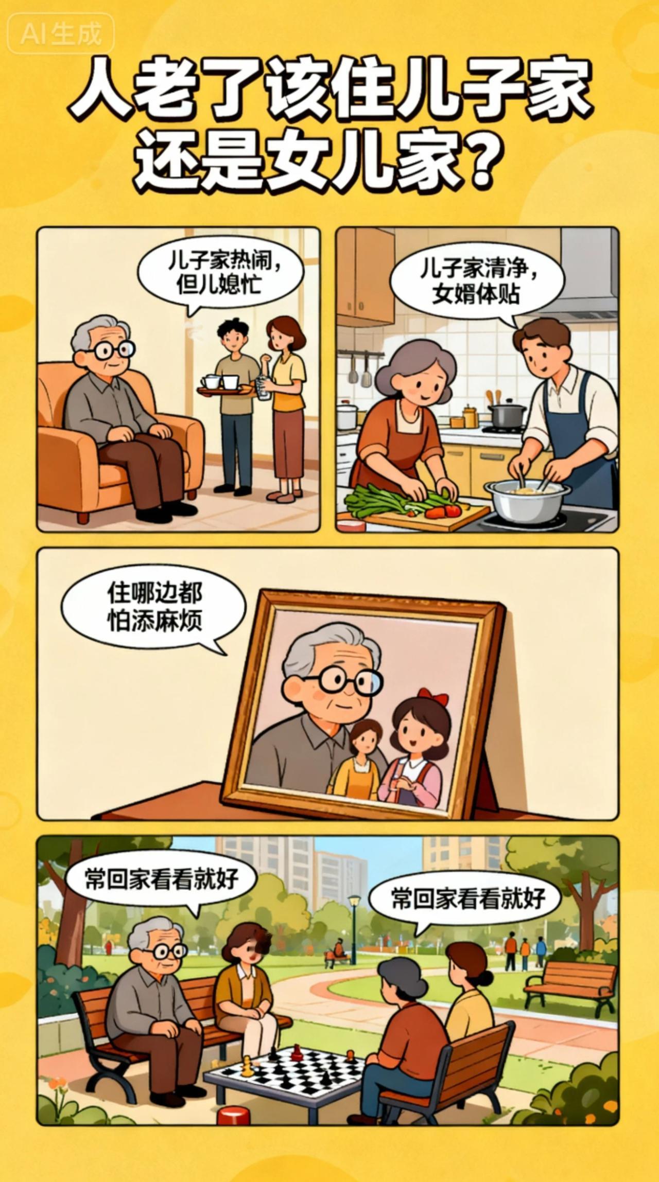 人老了,住儿子家好,还是住女儿家好? 这个问题要以我看来,住哪里都不好,还是要住自己家好。 如果老伴还在,就两个人单独住一起,不要住儿子家,也不要住女儿家。 如果只有一个了,身体健康也可以单独住。但如果身体不好了,最好还是住儿子家,因为这是我们刻在骨子里的思维习惯。 因为买车买房,都是想到给儿子买的,又没有谁给女儿买买车买房。所以当到了养老的时候,也自然该儿子管。这是大家默认的一个习惯。