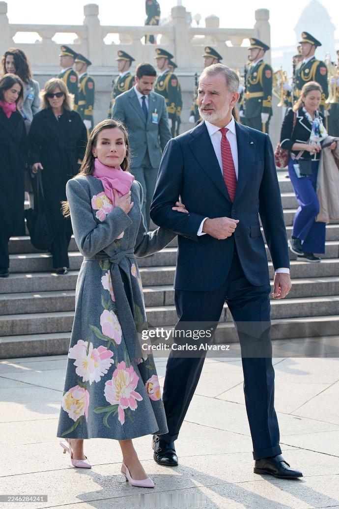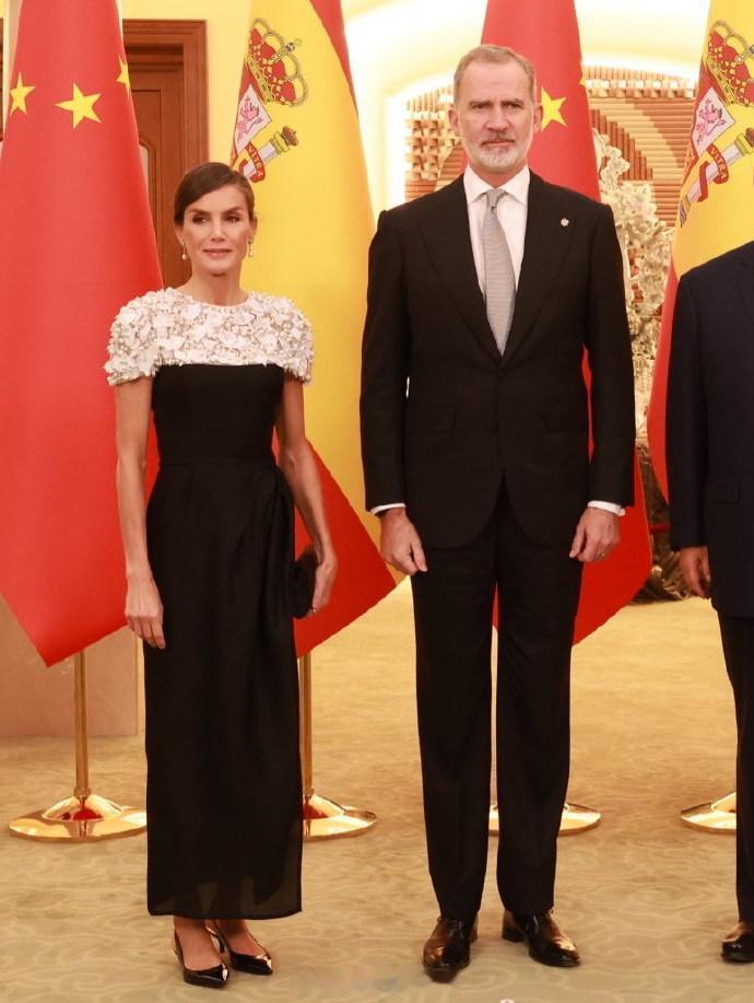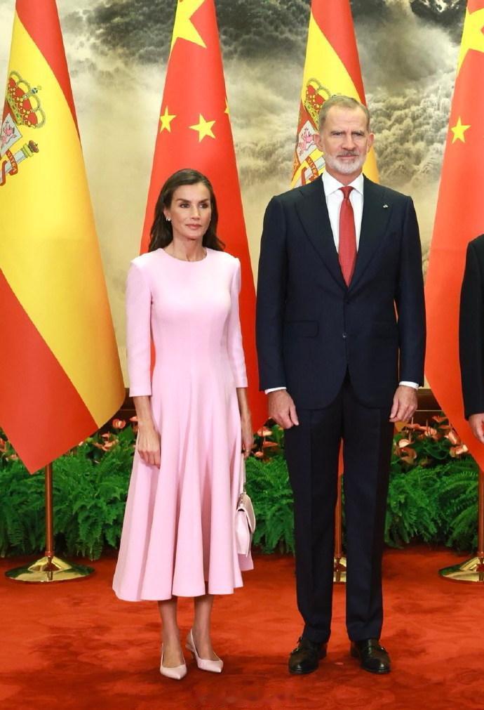 对我国的国事访问进入第二天,今天也是西班牙国王菲利普六世和王后莱蒂齐亚这趟访问的重头戏,包括欢迎仪式和国宴 由于技术原因图片需要裁剪,莱蒂齐亚日间的粉花灰大衣以及夜间的黑白礼服都来自她很喜欢的品牌carolina herrera 日间可见大衣下面,莱蒂齐亚穿了一身粉。她后续还去了特殊学校跟孩子们打招呼,算访问时女眷的常见去处 夜间宴会上,莱蒂齐亚罕见盘了个发,这是今年她第一次认真盘发,效果也算本年最佳了