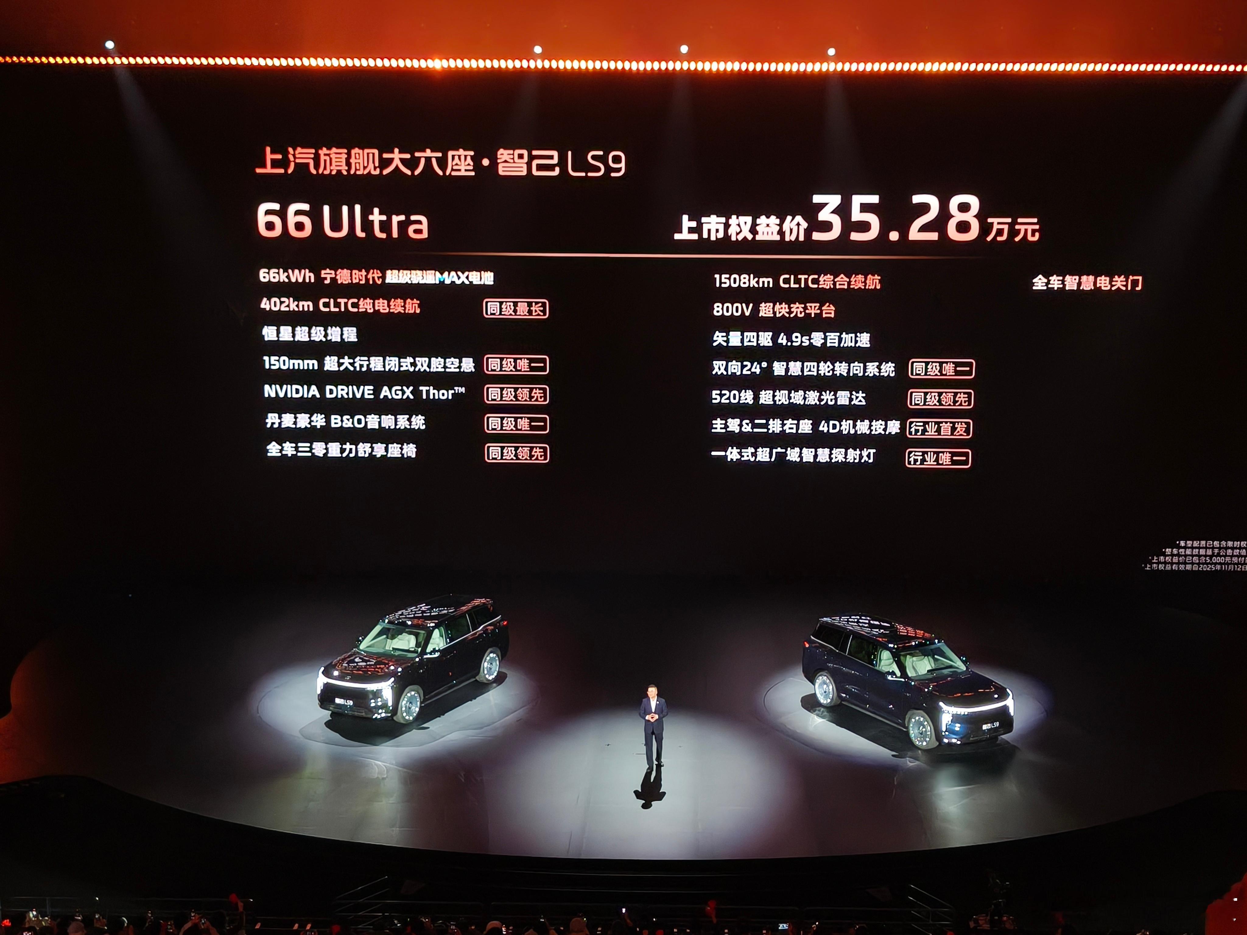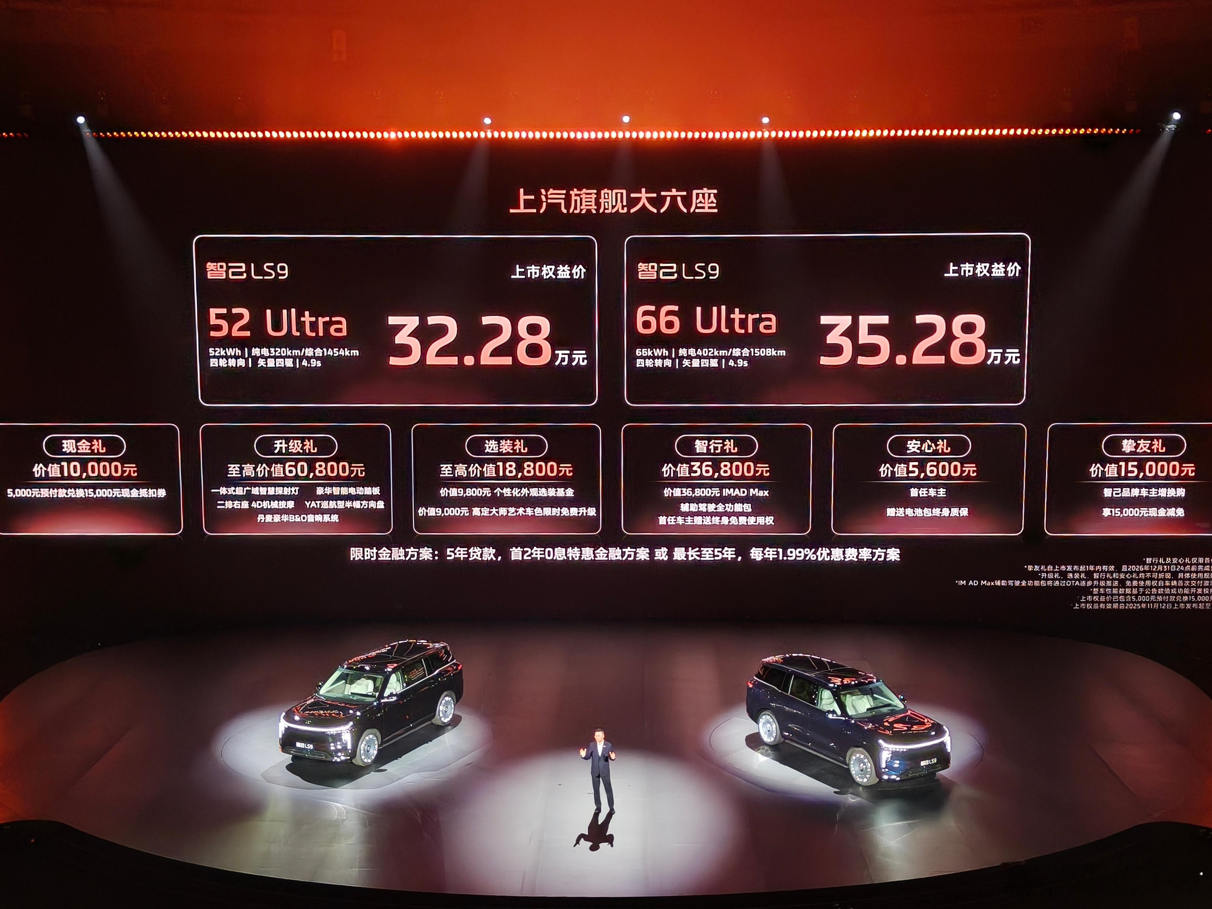 上汽旗舰智己LS9价格权益:52 Ultra版预售权益价32.28万元66 Ultra版预售权益价35.28万元5000元意向金抵15000元;免费升级B&O音响等价值58800元配置 ;送外观选装基金、二排右座4D机械按摩;IM AD高级辅助驾驶全功能包终身免费,电池包终身质保!全系皆 Ultra, 入门即巅峰,比小型车更灵活,比五座车更好开~驾控、性能、智能、豪华,每一面皆旗舰!提供宁德时代52度和66度两种电池选择