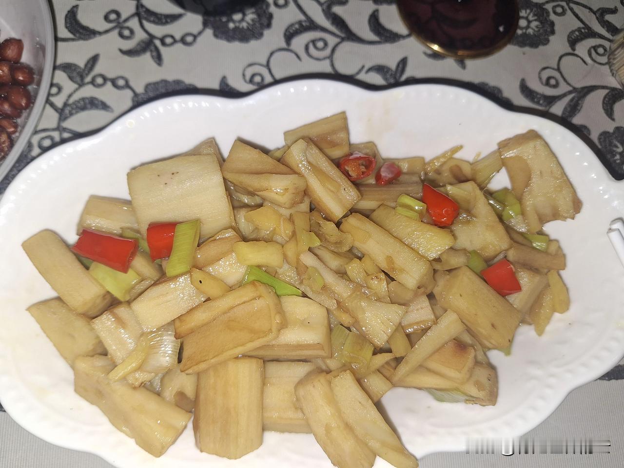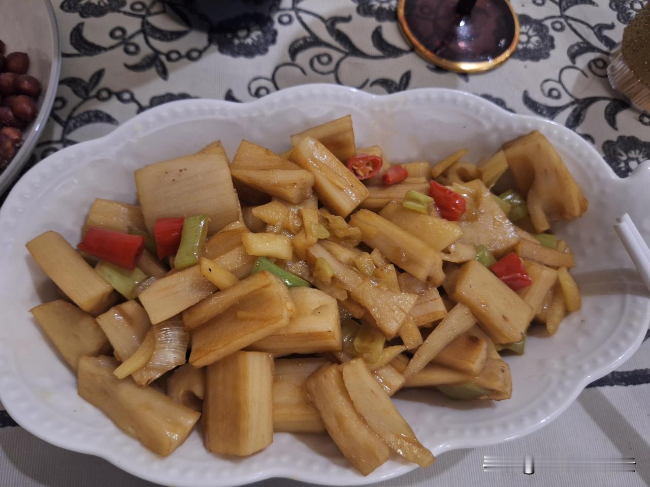 看我自创名菜——珊瑚藕丁,藕瓜去皮切丁,淘洗干净,姜丝爆锅,放入藕丁,快速翻炒,加适量热水,放冰糖、盐、小米辣切段,慢火煨二十分钟,加醋再煨十分钟,放入香葱起锅装盘,酸甜辣脆香,五维一体,尤其是小米辣点缀其中,宛若娇艳欲滴的红珊瑚。