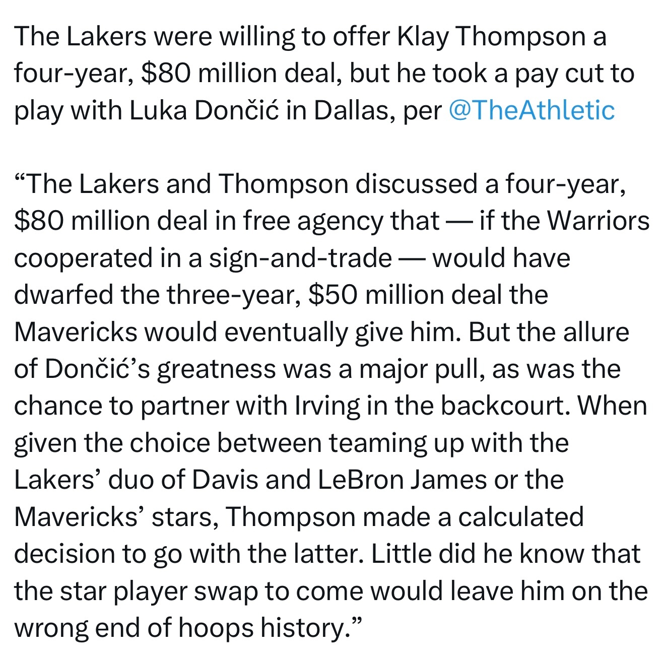 The Athletic报道,湖人曾有意向克莱·汤普森提供一份4年8000万美元的合同,但最终他选择降薪加盟独行侠,与东契奇并肩作战。“湖人与汤普森在自由市场上曾商讨过一份4年8000万美元的合约——若勇士队配合完成先签后换,这份报价将远超独行侠最终开出的3年5000万美元。但东契奇的超凡实力构成了巨大吸引力,与凯里·欧文组成后场搭档的机会同样关键。当需要在湖人的戴维斯、勒布朗组合与独行侠双星之间做出选择时,汤普森经过权衡后选择了后者。他未曾料到,随后的球星变动竟让自己成为篮球历史转折点的见证者。”