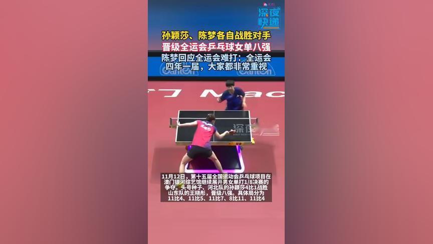 11月12日,全运会乒乓球女单1/8决赛战罢,孙颖莎、陈梦双双击败对手晋级八强。赛场上攻防凌厉的她们,再次展现顶尖实力;陈梦那句“全运会四年一届,大家都很重视”,也道尽这场国内乒乓盛宴的激烈。姑娘们继续冲!