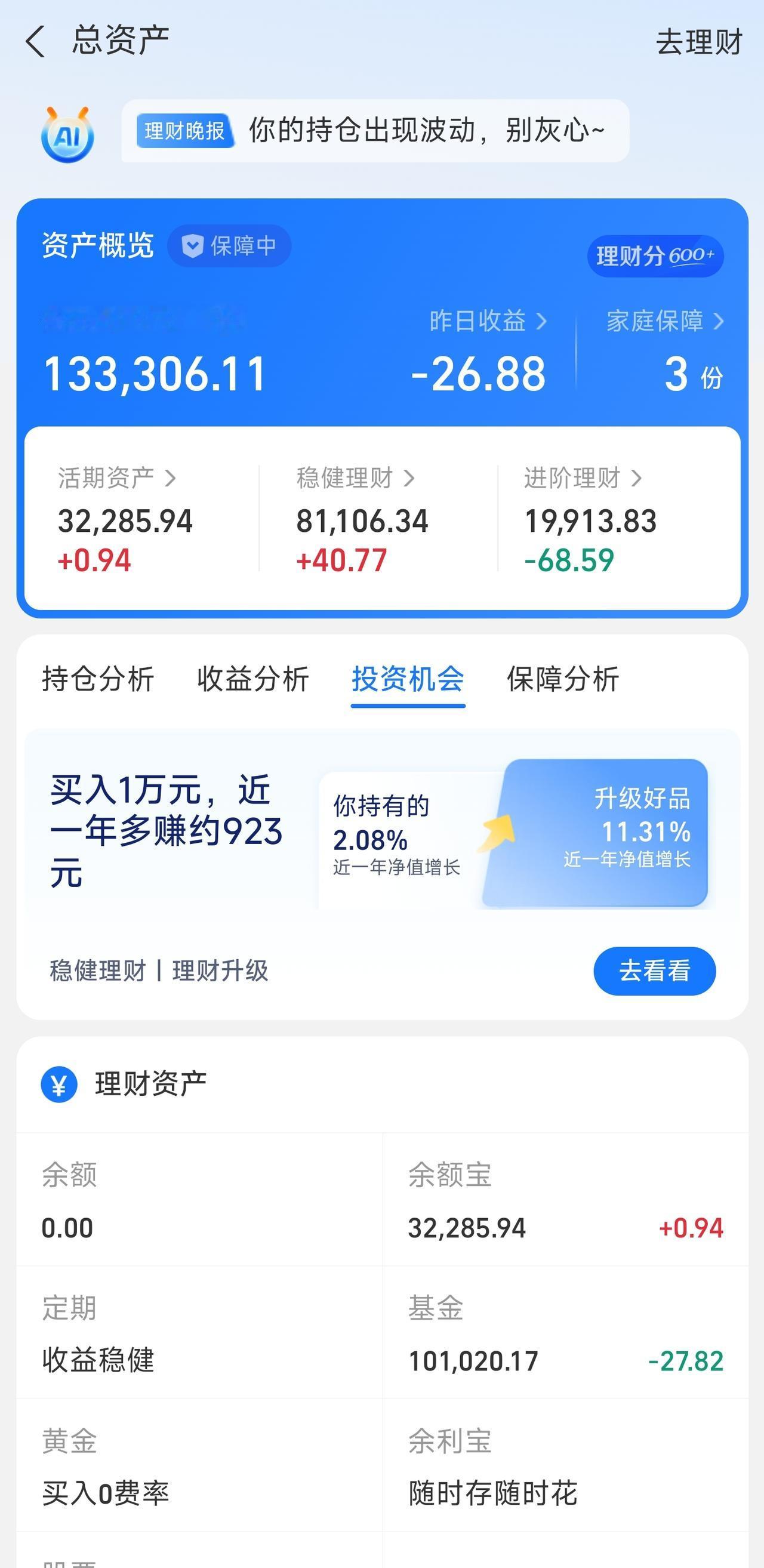 昨天a股起起伏伏,最终还是保住了4000点。 对于护盘队来说,股票真的像一场没有硝烟的战争。他们就是守城的一方。你来我往,丝毫不逊于一场战争。 我的持仓情况: 天弘上证50ETF联接C 3,030.81 +8.83 +30.81 +1.03% 天弘中证全指证券公司 ETF联接C 3,963.0 -25.78 -36.23 -0.91% 天弘创业板ETF联接C 3,955.21 -14.37 -44.79 -1.12% 易方达中债3-5年国开行 鼷接C 10,063.95 +4.36 +63.95 +0.44% 南方基金财富号> 南方中债7-10年国开行 40,097.16 +97.16