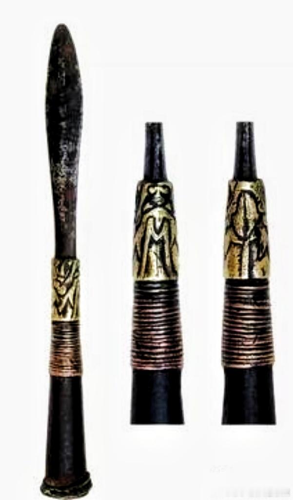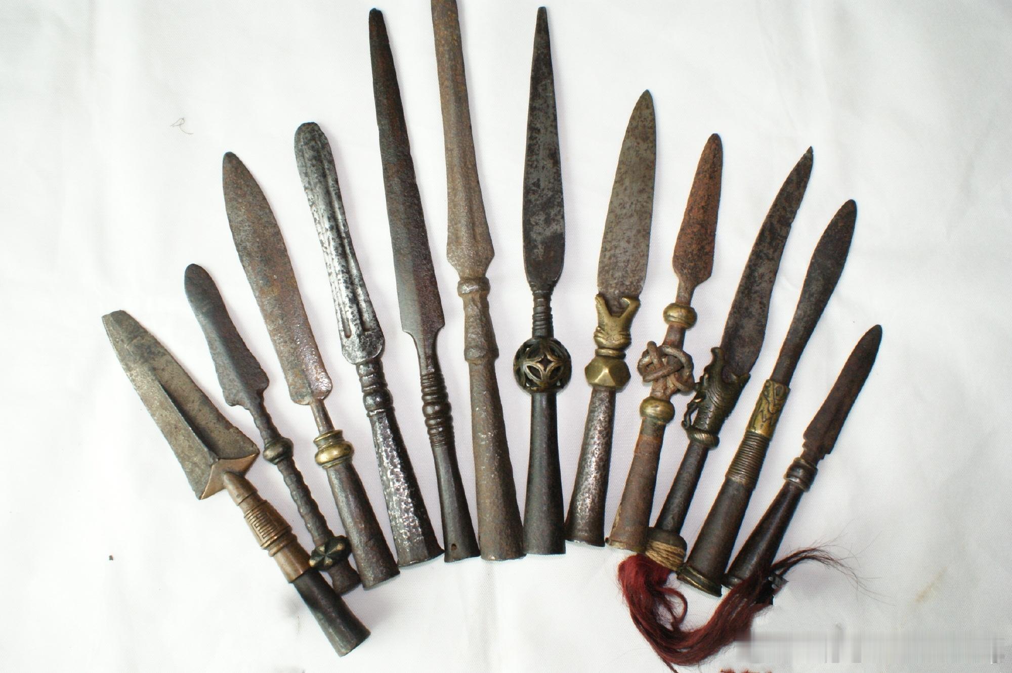 也说绿营枪头 古兵圈里有个约定俗成的一个名词“绿营枪头”,由于大部分人对于中国古代兵器的认识仅仅来源于少的可怜的几本古书和古代绘画作品,碰上能对上号的就大概能照搬名称,碰到书上或画里没有的,就有人会创造出来一个新名词来,当然也是做了一些功课后, 这个绿营枪头大抵特指大量存在于山东鲁西鲁中一带的枪头(胶东沿海地区比较少见)。特征是:尺寸基本硕大(指和扎枪相比),多带铜箍,有的铜箍分几层,铜上点缀有圆形或其它纹饰,但是纹饰大都比较简陋。部分枪身有铜星装饰,一星、多星都有,部位分布于枪尖、枪身中部,根部,有的铜星脱落后可见铜星是直贯前后的,但多嵌在表面。高级一点的会有铭文刻于铜箍之上。同样形制的还有透甲锥、挂月牙枪、戟形等。 因为长年在山东的缘故,这么多年来此类“绿营枪头”平常都能见到,和其它古兵不同的是,“量大”!,早年去过一线的大跑家家里,这类枪头子基本上是整麻袋整麻袋装的,少数有铜箍、铜星的被卖家郑重其事地摆出来要高价。 时值今日,去鲁西北一些古玩市场,这类枪头仍然大量存在于古玩店内(相较于其他古兵而言……) 关于绿营枪头的争议早已有之,在此不再絮言。 从自己的角度谈谈对绿营枪头的看法,首先绿营是正规军,也就是说不只山东有绿营,全国都有绿营,为什么此类枪头仅见于山东部分地区?从传世清中晚期画作中可以看到,清军使用的枪头枪身细长,尖而锐,从自己收藏的一些明清枪头看,制式枪头或订制枪头以实用为原则,除龙吞和其它必要的造型装饰之外,少有在枪身上签铜,甚至于镂空枪身来嵌铜星。 枪头硕大的造型在清中晚期火器大量装备后,兵士身着铁盔甲的情况已经少见,少量配棉甲(绿营,这里不谈八旗兵),观察好多枪头基本没有开刃,枪头部谈不上锐,枪身边缘也谈不上锐利,当然也有开了刃的,和手里的其它枪头明显感觉到实战性差一截。 很多朋友争论如果不是制式,怎么会那么多?并且形制如此统一? 我理解是否为山东团练组织统一标准制作?团练作为民间武装,朝廷上下是既利用其稳定乡梓,又在武备上防止其坐大影响到正规军队。在武器装备上主要是唬人就可以了……战斗力是忽略不计的,由于团练武装经费基本靠各地自筹,所以山东地方团练组织按照一定标准统一制作了这些被后世称为“绿营枪头”的武备。 加上山东近代以来红枪会等各种怪力乱神风起云涌不断,社会治安状况一直堪忧,所以才会有民间大量存放枪头、大刀,习武之风盛行。 综上所述,我认为此类枪头不宜称之为“绿营枪头”,似称其“山东枪头”为合适一些。一家之言,供大家批评。 附图一至三为山东枪头,五为实战藏枪,六后面为实战花枪,七八图为部分明清实战枪头。