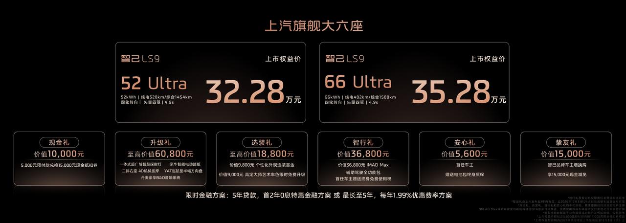 上汽这波直接把智己LS9焊死在30万级“卷王”位上了吧? “全系皆Ultra、入门即巅峰”真不是吹,这大六座SUV居然能比小型车还灵活、比五座车更好开,驾控、性能、智能、豪华没一个短板,等于花30多万直接拉满旗舰体验。宁德时代52/66度双电池选项也够实在,32.28万起的价格往这一放,同价位合资车估计得连夜改配置表。