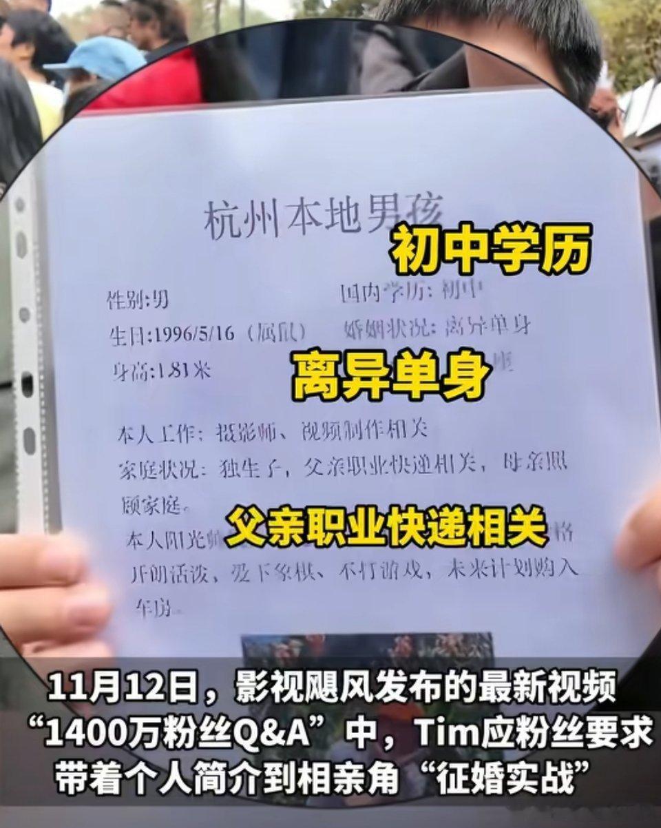 影视飓风Tim相亲,资料写的都是真的,也没有撒谎,为啥会有人破防了呢?越是富二代相亲,越是会想找一个不图钱而是真心喜欢自己的人,这是为了保护自己。