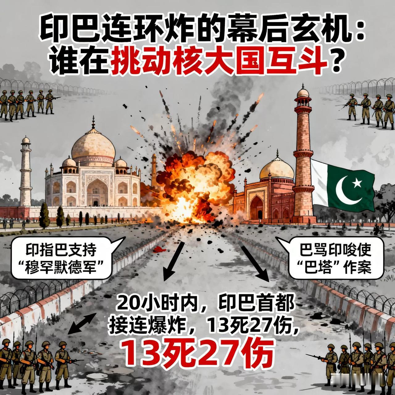 印巴连环炸的幕后玄机:谁在挑动核大国互斗? 20小时内,印巴首都接连爆炸,13死27伤。印指巴支持“穆罕默德军”,巴骂印唆使“巴塔”作案,边境重兵集结。实则是恐怖组织借爆炸挑矛盾,政客甩锅转移国内压力,地缘势力暗中煽风,拿核大国对峙当“棋局”牟利。印巴外交冲突 印巴冲袭 印巴地缘危机
