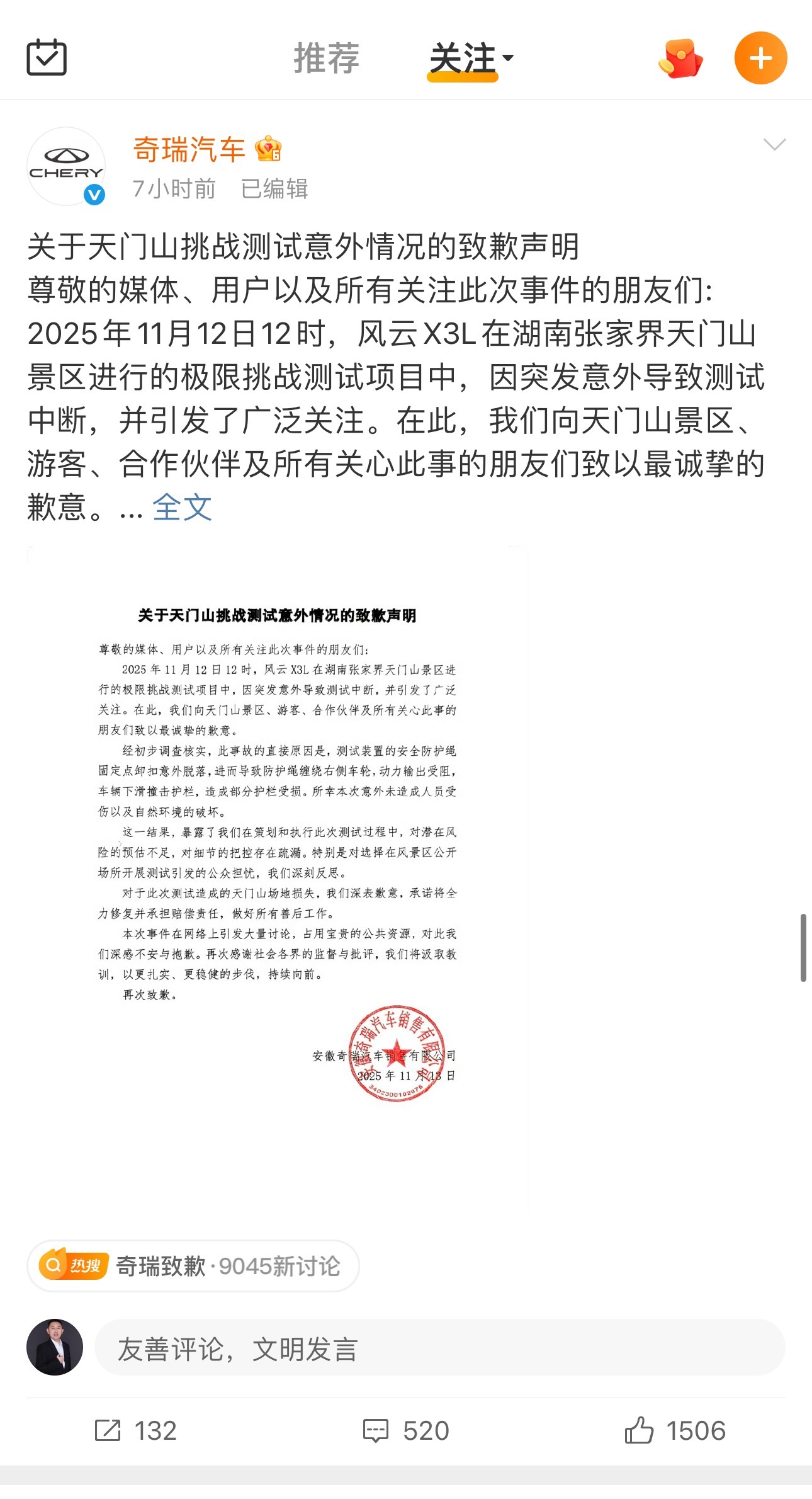 关于天门山挑战测试意外情况的致歉声明尊敬的媒体、用户以及所有关注此次事件的朋友们:2025年11月12日12时,风云X3L在湖南张家界天门山景区进行的极限挑战测试项目中,因突发意外导致测试中断,并引发了广泛关注。在此,我们向天门山景区、游客、合作伙伴及所有关心此事的朋友们致以最诚挚的歉意。经初步调查核实,此事故的直接原因是,测试装置的安全防护绳固定点卸扣意外脱落,进而导致防护绳缠绕右侧车轮,动力输出受阻,车辆下滑撞击护栏,造成部分护栏受损。所幸本次意外未造成人员受伤以及自然环境的破坏。这一结果,暴露了我们在策划和执行此次测试过程中,对潜在风险的预估不足,对细节的把控存在疏漏。特别是对选择在风景区公开场所开展测试引发的公众担忧,我们深刻反思。对于此次测试造成的天门山场地损失,我们深表歉意,承诺将全力修复并承担赔偿责任,做好所有善后工作。本次事件在网络上引发大量讨论,占用宝贵的公共资源,对此我们深感不安与抱歉。再次感谢社会各界的监督与批评,我们将汲取教训,以更扎实、更稳健的步伐,持续向前。再次致歉。安徽奇瑞汽车销售有限公司2025年11月13日