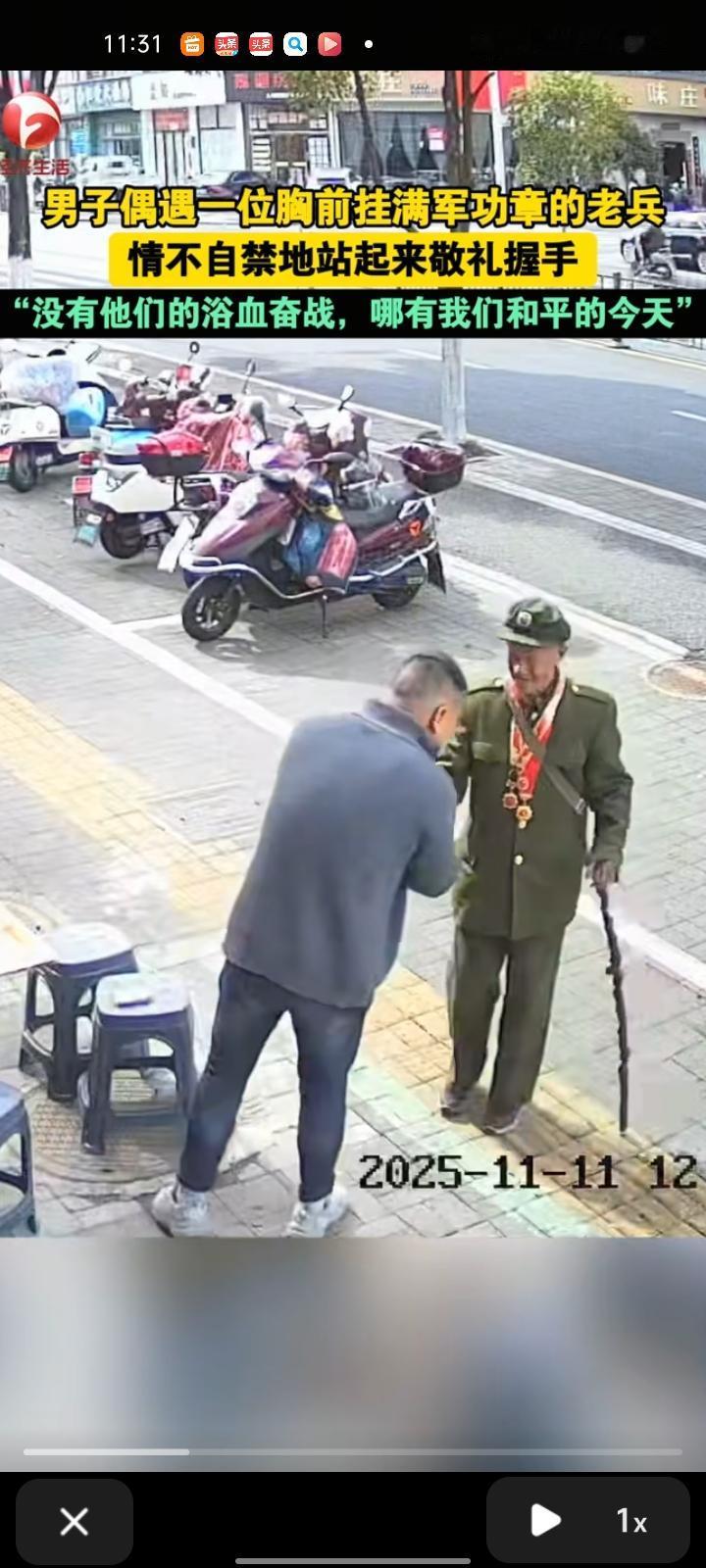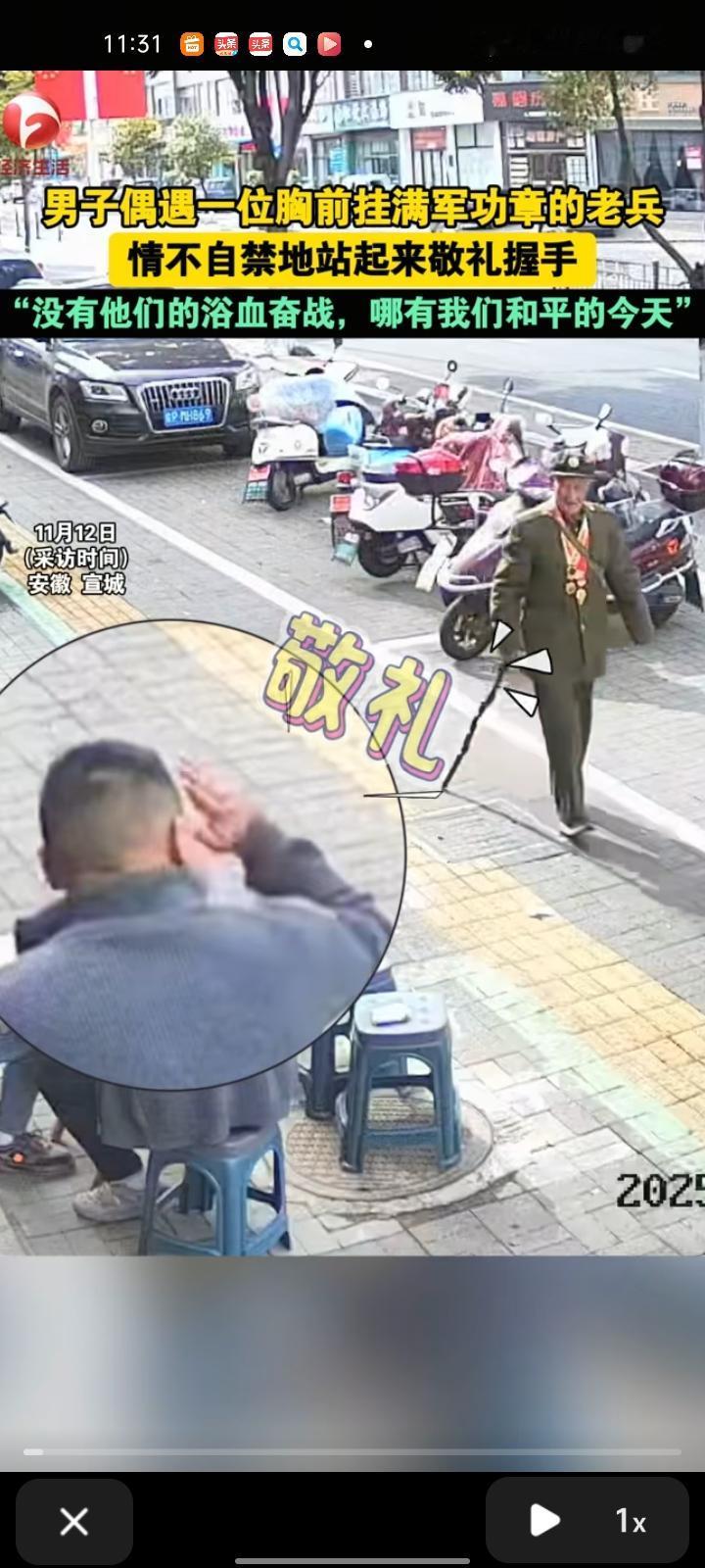 11月11日,宣城市绩溪县。男子和朋友在店门口聊天,一位挂满军功章的老兵路过,男子情不自禁的站起来敬礼,对老兵握个手。 当事人巫先生表示,自己没当过兵,也不认识这位老兵,当时真是情不自禁向这位老军人敬个礼。没有他们的浴血奋战,哪有今天的和平。